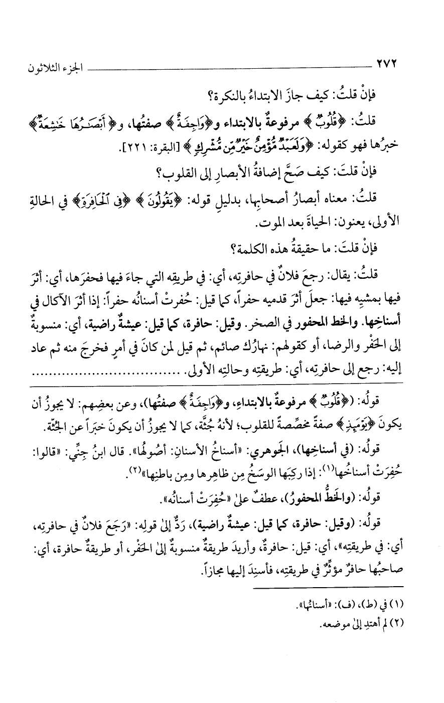 قلت: يقال: رجع فلان في حافرته، أي: في طريقه التي جاء فيها فحفرها، أي: أثر فيها بمشيه فيها: جعل أثر قدميه حفراً، كما قيل: حفرت أسنانه حفراً: إذا أثر الآكال في أسناخها. والخط المحفور في الصخر. وقيل: حافرة، كما قيل: عيشة راضية، أي: منسوبة إلى الحفر والرضا، أو كقولهم: نهارك صائم، ثم قيل لمن كان في أمر فخرج منه ثم عاد إليه: رجع إلى حافرته، أي: طريقته وحالته الأولى ....
