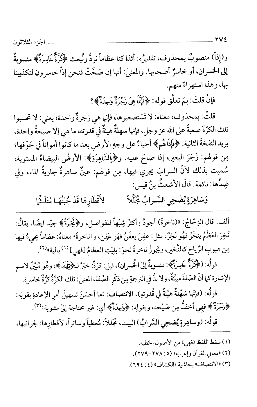 قوله: ({كَرَّةٌ خَاسِرَةٌ}: منسوبة إلى الخُسران)، قيل: كرة: خبر لـ {تِلْكَ}، وهو مبين لاسم الاشارة كما ان الصفة مبينة، ولا بد في الترجمة من ذكر الصفة، المعنى: تلك الكرة كرة خاسرة.