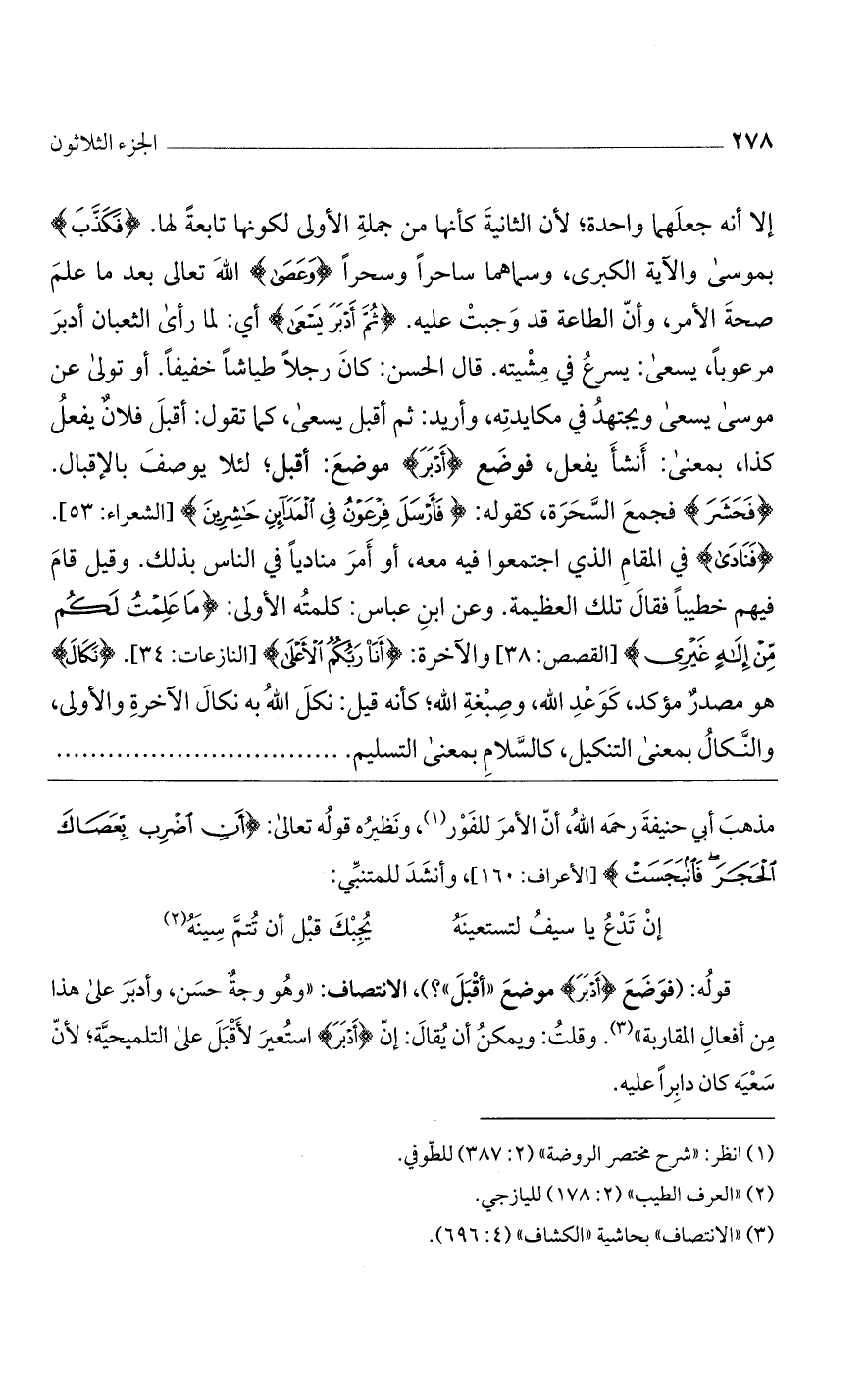 إلا أنه جعلهما واحدة؛ لأن الثانية كأنها من جملة الأولى لكونها تابعة لها. (فَكَذَّبَ) بموسى والآية الكبرى، وسماهما ساحراً وسحراً (وعَصَى) الله تعالى بعد ما علم صحة الأمر، وأن الطاعة قد وجبت عليه. (ثُمَّ أَدْبَرَ يَسْعَى) أي: لما رأى الثعبان أدبر مرعوباً، يسعى: يسرع في مشيته. قال الحسن: كان رجلاً طياشاً خفيفاً. أو تولى عن موسى يسعى ويجتهد في مكايدته، وأريد: ثم أقبل يسعى، كما تقول: أقبل فلان يفعل كذا، بمعنى: أنشأ يفعل، فوضع (أَدْبَرَ) موضع: أقبل؛ لئلا يوصف بالإقبال. (فَحَشَرَ) فجمع السحرة، كقوله (فَأَرْسَلَ فِرْعَوْنُ فِي المَدَائِنِ حَاشِرِينَ) [الشعراء: 53]. (فَنَادَى) في المقام الذي اجتمعوا فيه معه، أو أمر منادياً في الناس بذلك. وقيل قام فيهم خطيباً فقال تلك العظيمة. وعن ابن عباس: كلمته الأولى: (مَا عَلِمْتُ لَكُم مِّنْ إلَهٍ غَيْرِي) [القصص: 38] والآخرة: (أَنَا رَبُّكُمُ الأَعْلَى) [النازعات: 24]. (نَكَالَ) هو مصدر مؤكد، كوعد الله، وصبغة الله؛ كأنه قيل: نكل الله به نكال الآخرة والأولى، والنكال بمعنى التنكيل، كالسلام بمعنى التسليم