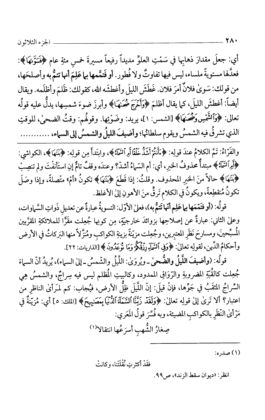 قوله: (وأضيف الليل والضحى - ويروى: الليل والشمس - إلى السماء)، يريد أن السماء جعلت كالقبة المضروبة والرواق الممدود، وكالبيت المظلم ليس فيه سراج، والشمس هي السراج المثقب في جوها، فإن قيل: إن الليل ظل الأرض، فيجاب: كم لمرأى الناظر من اعتبار؟ ألا ترى إلى قوله تعالى: {وَلَقَدْ زَيَّنَّا السَّمَاءَ الدُّنْيَا بِمَصَابِيحَ} [الملك: 5] أي: مُزينة في مرأى النظر بالكواكب المضيئة، وبه فسر قول المعري: