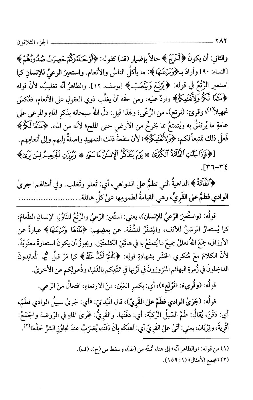 قوله: (جرى الوادي فطم على القرى)، قال الميداني: "أي: جرى سبيل الوادي فطم، أي: دفن، يقال: طم السيل الركية، أي: دفنها. والقري: مجرى الماء في الروضة والجمع: أقرية، وقريان، يعني: أتى على القرى أي: أهلكه بأن دفنه، يُضرب عند تجاوز الشر حده".