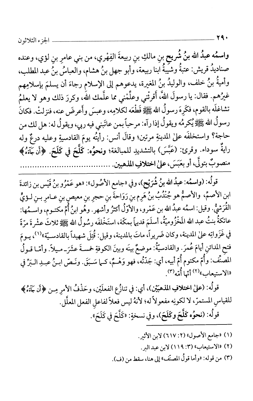قوله: (واسمه: عبد الله بن شريح)، وفي "جامع الأصول": "هو عمرو بن قيس بن زائدة ابن الأصم، والأصم هو جندب بن هرم بن رواحة بن حجر بن معيص بن عامر بن لؤي القُرشي. وقيل: اسمه عبد الله بن عمرو، والأول أكثر وأشهر. وهو ابن أم مكتوم، واسمها: عاتكة بنت عبد الله المخزومية، أسلم قديماً بمكة، استخلفه رسول الله? ثلاث عشرة مرة في غزواته على المدينة، وكان ضريراً، مات بالمدينة، وقيل: قُتل شهيداً بالقادسية"، يوم فتح المدائن أيام عمر. والقادسية: موضع بينه وبين الكوفة خمسة عشر - ميلاً. وأما قول المصنف: وأم مكتوم أم أبيه، أي: جدته، فهو وهم، كما سبق. ونص ابن عبد البر في "الاستيعاب" أنه أمه.