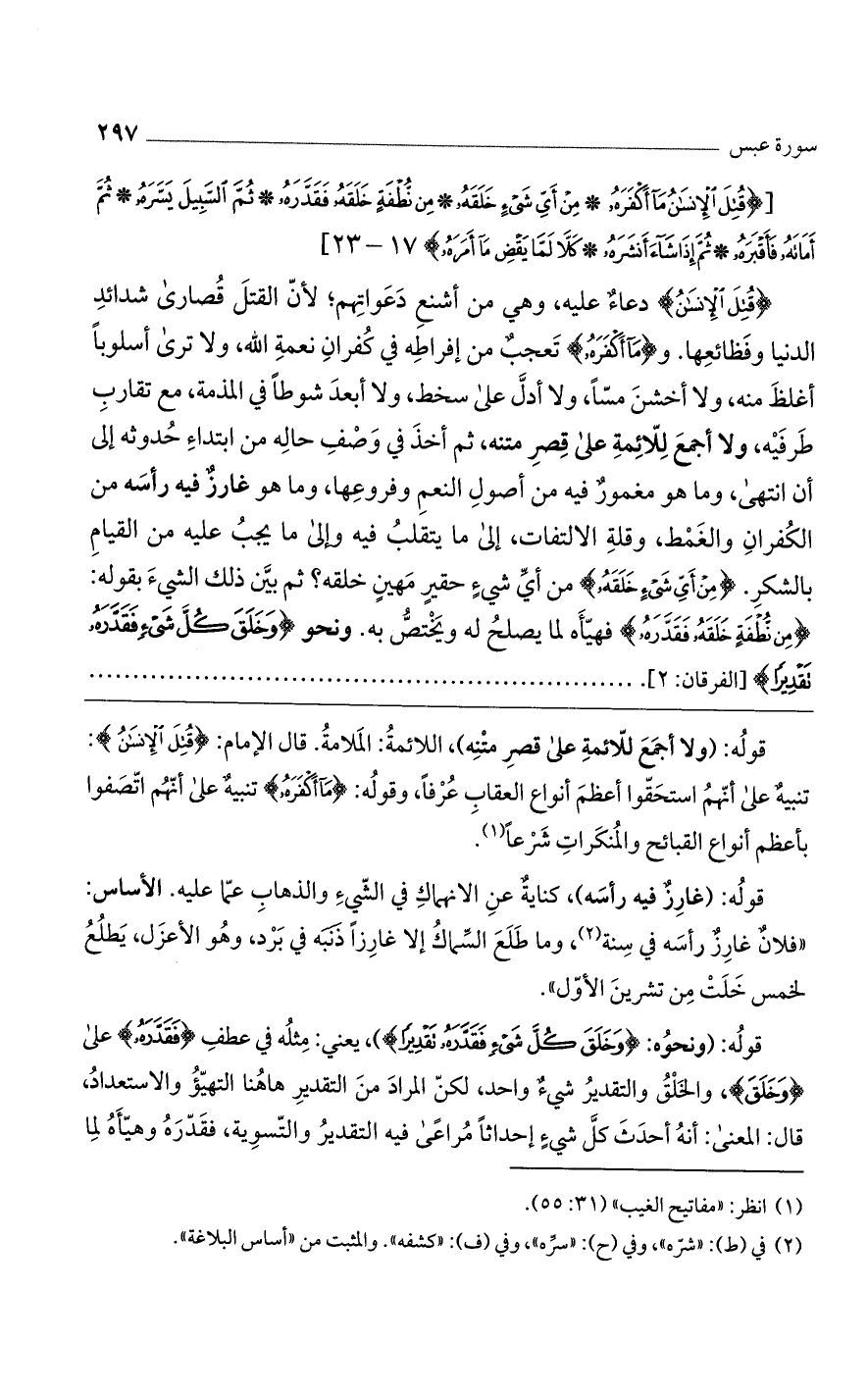(قُتِلَ الإنسَانُ) دعاء عليه، وهي من أشنع دعواتهم؛ لأن القتل قصارى شدائد الدنيا وفظائعها. و (مَا أَكْفَرَهُ) تعجب من إفراطه في كفران نعمة الله، ولا ترى أسلوباً أغلظ منه. ولا أخشن مساً، ولا أدل على سخط، ولا أبعد شوطاً في المذمة، مع تقارب طرفيه، ولا أجمع للائمة على قصر متنه، ثم أخذ في وصف حاله من ابتداء حدوثه إلى أن انتهى، وما هو مغمور فيه من أصول النعم وفروعها، وما هو غارز فيه رأسه من الكفران والغمط، وقلة الالتفات، إلى ما يتقلب فيه وإلى ما يجب عليه من القيام بالشكر. (مِنْ أَيِّ شَيْءٍ خَلَقَهُ) من أي شيء حقير مهين خلقه؟ ثم بين ذلك الشيء بقوله: (مِن نُّطْفَةٍ خَلَقَهُ فَقَدَّرَهُ) فهيأه لما يصلح له ويختص به. ونحوه (وخَلَقَ كُلَّ شَيْءٍ فَقَدَّرَهُ تَقْدِيرًا) [الفرقان: 2]