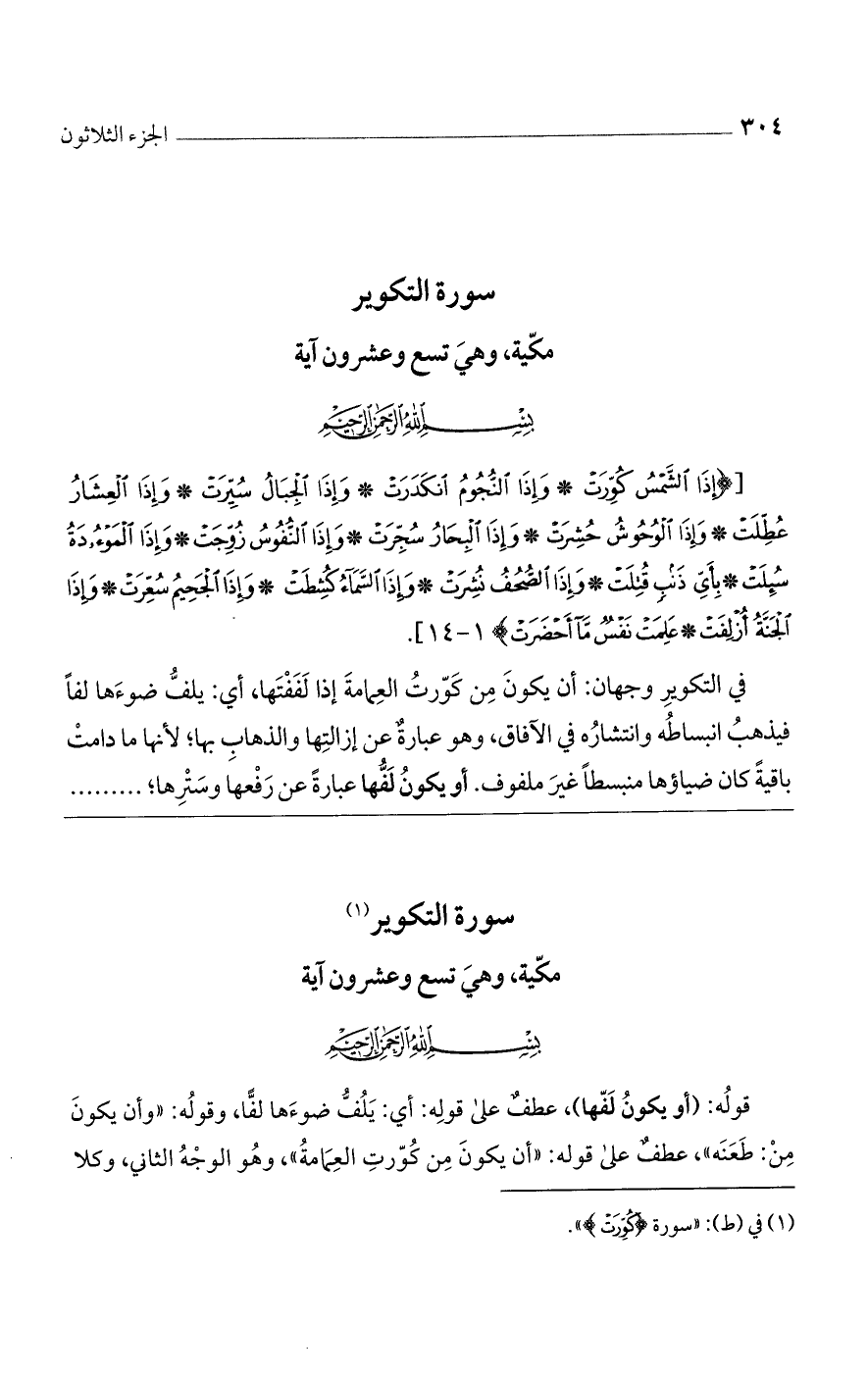 [(إِذَا الشَّمْسُ كُوِّرَتْ • وَإِذَا النُّجُومُ انْكَدَرَتْ • وَإِذَا الْجِبالُ سُيِّرَتْ • وَإِذَا الْعِشارُ عُطِّلَتْ • وَإِذَا الْوُحُوشُ حُشِرَتْ • وَإِذَا الْبِحارُ سُجِّرَتْ • وَإِذَا النُّفُوسُ زُوِّجَتْ • وَإِذَا الْمَوْؤُدَةُ سُئِلَتْ • بِأَيِّ ذَنْبٍ قُتِلَتْ • وَإِذَا الصُّحُفُ نُشِرَتْ • وَإِذَا السَّماءُ كُشِطَتْ • وَإِذَا الْجَحِيمُ سُعِّرَتْ • وَإِذَا الْجَنَّةُ أُزْلِفَتْ • عَلِمَتْ نَفْسٌ ما أَحْضَرَتْ) 1 ـ 14].