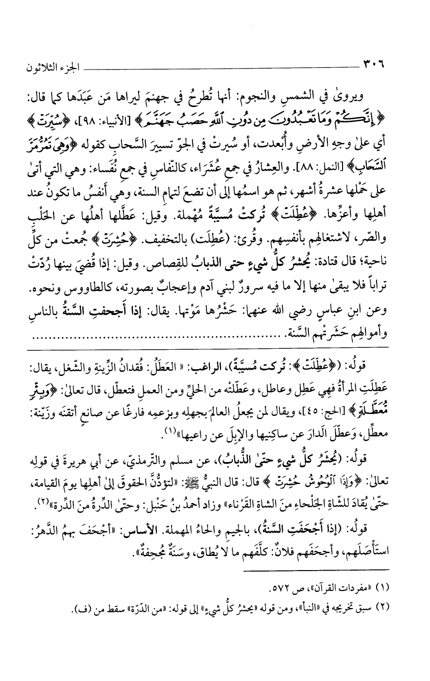 ويروى في الشمس والنجوم: أنها تطرح في جهنم ليراها من عبدها كما قال: (إِنَّكُمْ وَما تَعْبُدُونَ مِنْ دُونِ اللَّهِ حَصَبُ جَهَنَّمَ) [الأنبياء: 98]، (سُيِّرَتْ) أي على وجه الأرض وأبعدت، أو سيرت في الجوّ تسيير السحاب كقوله (وَهِيَ تَمُرُّ مَرَّ السَّحابِ) [النمل: 88]. والعشار في جمع عشراء، كالنفاس في جمع نفساء: وهي التي أتى على حملها عشرة أشهر، ثم هو اسمها إلى أن تضع لتمام السنة، وهي أنفس ما تكون عند أهلها وأعزها. (عُطِّلَتْ) تركت مسيبة مهملة. وقيل: عطلها أهلها عن الحلب والصر، لاشتغالهم بأنفسهم. وقرئ: (عطلت) بالتخفيف. (حُشِرَتْ) جمعت من كل ناحية؛ قال قتادة: يحشر كل شيءٍ حتى الذباب للقصاص. وقيل: إذا قضى بينها ردّت تراباً فلا يبقى منها إلا ما فيه سرورٌ لبنى آدم وإعجابٌ بصورته، كالطاوس ونحوه. وعن ابن عباسٍ رضي الله عنهما: حشرها موتها. يقال: إذا أجحفت السنة بالناس وأموالهم حشرتهم السنة
