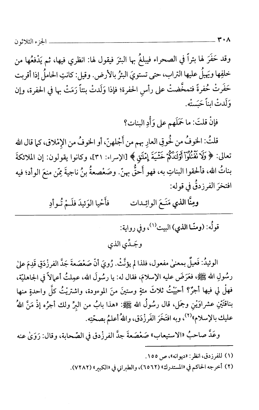 الوئيد: فعيل بمعنى مفعول، فلذا لم يؤنث. روي أن صعصعة جد الفرزدق قدم على رسول الله? ، فعرض عليه الإسلام، فقال له: يا رسول الله، عملت أعمالاً في الجاهلية، فهل لي فيها أجر؟ أحييت ثلاث مئة وستين من الموءودة، واشتريت كل واحدة منها بناقتين عشراوين وجمل، قال رسول الله? : "هذا باب من البر ولك أجره إذ من الله عليك بالإسلام"، وبه افتخر الفرزدق، والله أعلم بصحبته.