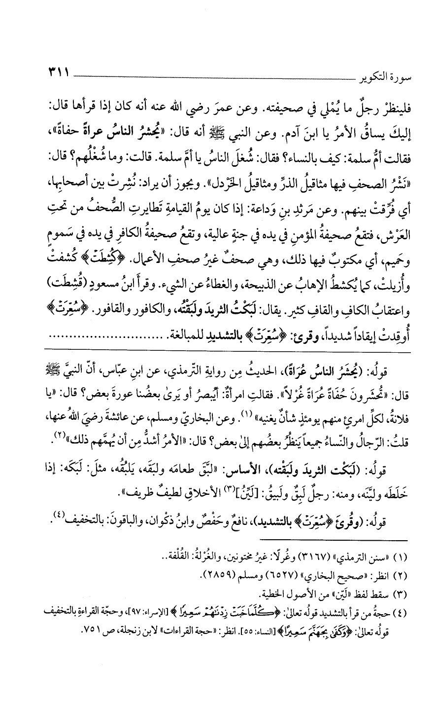 قوله: (يُحشر الناس عُراة)، الحديث من رواية الترمذي، عن ابن عباس، أن النبي? قال: "تحشرون حفاة عراة غُرلاً". فقالت امرأة: أيبصر أو يرى بعضنا عورة بعض؟ قال: "يا فلانة، لكل امرئٍ منهم يومئذٍ شأن يغنيه". وعن البخاري ومسلم، عن عائشة رضي الله عنها، قلت: الرجال والنساء جميعاً ينظر بعضهم إلى بعض؟ قال: "الأمر أشد من أن يُهمهم ذلك".