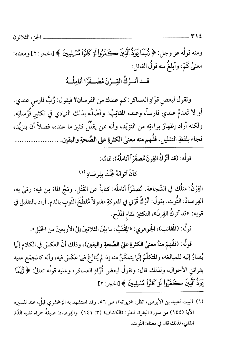 القرن: مثلك في الشجاعة. مُصفراً أنامله: كناية عن القتل. ومجَّ الماء من فيه: رمى به، الفرصاد: التوت. يقول: أترك قرني في المعركة مقتولاً مُلطخ الثوب بالدم. أراد بالتقليل في قوله: "قد أترك القِرن"، التكثير لمقام المدح.