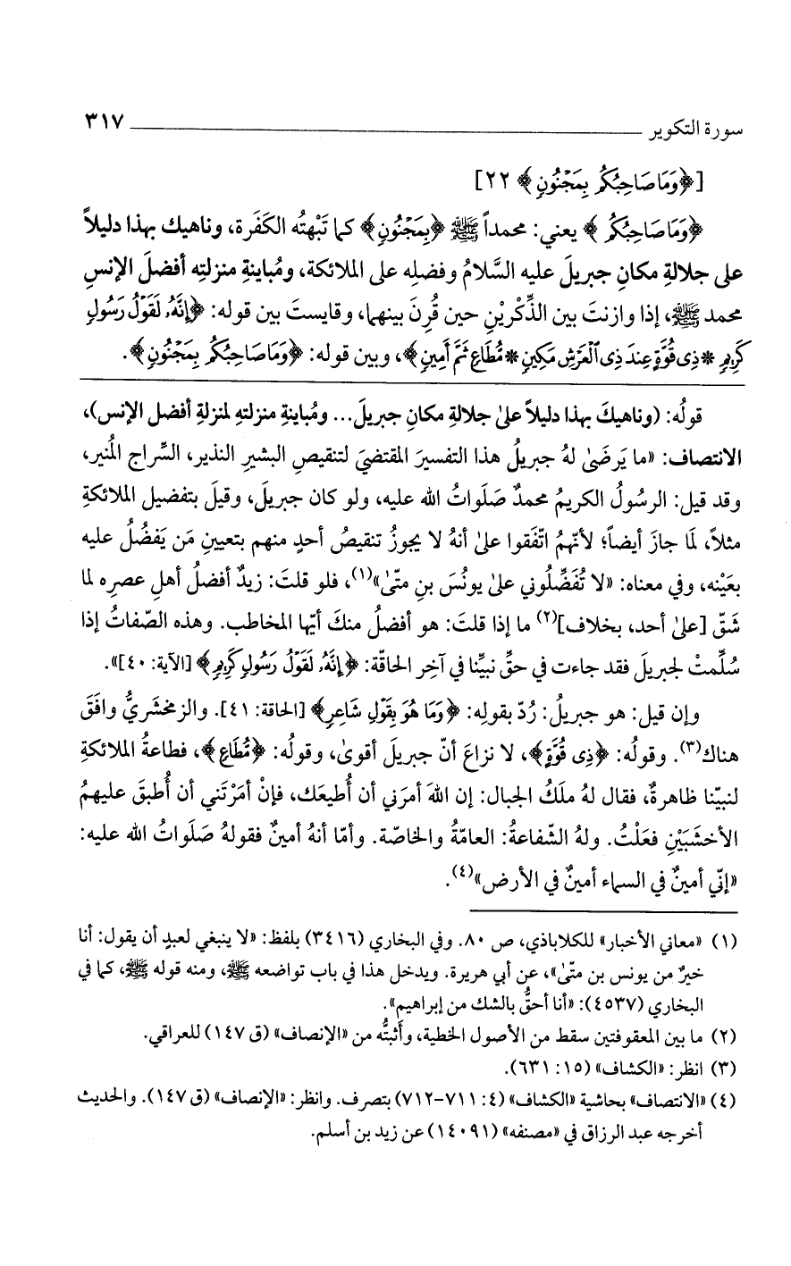قوله: (وناهيك بهذا دليلاً على جلالة مكان جبريل ... ومُباينة منزلة لمنزلة أفضل الإنس)، الانتصاف: "ما يرضى له جبريل هذا التفسير المقتضي لتنقيص البشير النذير، السراج المنير، وقد قيل: الرسول الكريم محمد صلوات الله عليه، ولو كان جبريل، وقيل بتفضيل الملائكة مثلاً، لما جاز أيضاً؛ لأنهم اتفقوا على أنه لا يجوز تنقيص أحد منهم بتعيين من يفضل عليه بعينه، وفي معناه: "لا تُفضلوني على يونس بن متى"، فلو قلت: زيد أفضل أهل عصره لما شق [على أحد، بخلاف] ما إذا قلت: هو أفضل منك أيها المخاطب. وهذه الصفات إذا سُلمت لجبريل في حق نبينا في آخر الحاقة: {إِنَّهُ لَقَوْلُ رَسُولٍ كَرِيمٍ} [الآية: 40] ".