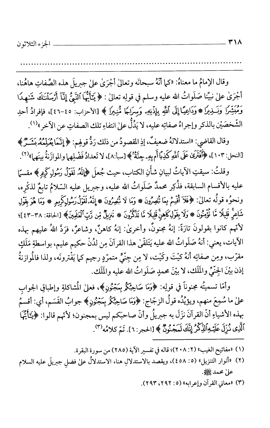 وقال الإمام ما معناه: "كما أنه سبحانه وتعالى أجرى على جبريل هذه الصفات هاهنا، أجرى على نبينا صلوات الله عليه وسلم في قوله تعالى: {يَاأَيُّهَا النَّبِيُّ إِنَّا أَرْسَلْنَاكَ شَاهِدًا وَمُبَشِّرًا وَنَذِيرًا (وَدَاعِيًا إِلَى اللَّهِ بِإِذْنِهِ وَسِرَاجًا مُّنِيرًا} [الأحزاب: 45 - 46]، فإفراد أحد الشخصين بالذكر وإجراء صفاته عليه، لا يدل على انتفاء تلك الصفات عن الآخر".