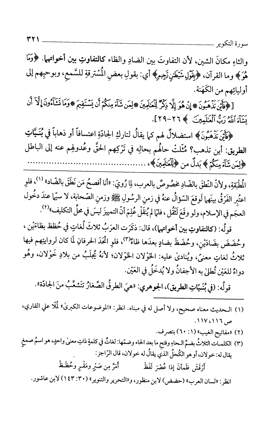 قوله: (كالتفاوت بين أخواتهما)، قال: ذكرت العرب ثلاث لغات في حُظظ بظاءين، وحُضض بضادين، وحُضظ بضاد بعدها ظاء، فلو اتحد الحرفان لما كان لروايتهم فيها ثلاث لغات معنى، وينادى عليه: الخَولان الخَولان؛ لأنه يجلب من بلاد خَولان، وهو دواء للعين تُطلى به الأجفان ولا يُدخل في العين.