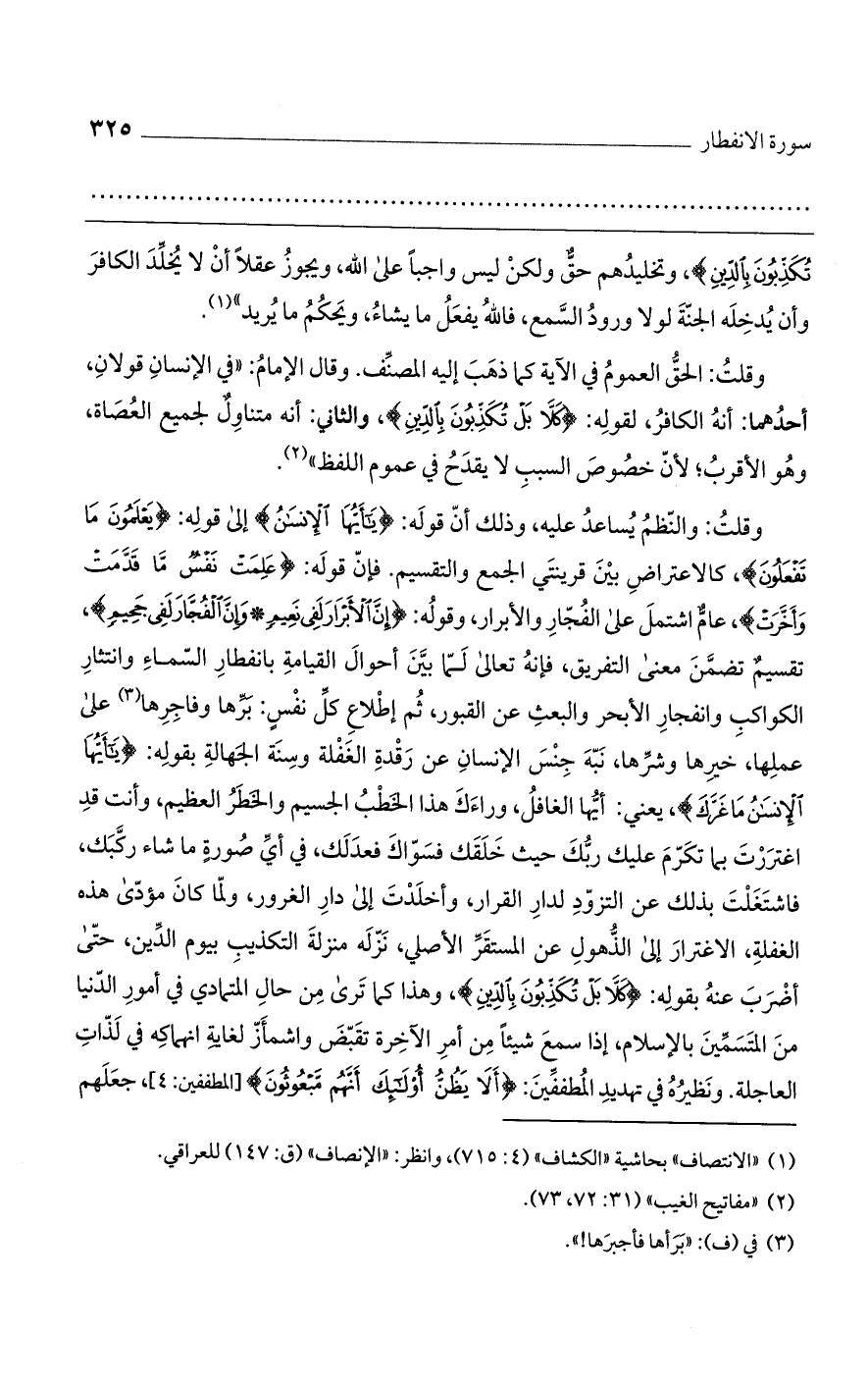 وقلت: والنظم يساعد عليه، وذلك أن قوله: {يَاأَيُّهَا الْإِنسَانُ} إلى قوله: {يَعْلَمُونَ مَا تَفْعَلُونَ}، كالاعتراض بين قرينتي الجمع والتقسيم. فإن قوله: {عَلِمَتْ نَفْسٌ مَّا قَدَّمَتْ وَأَخَّرَتْ}، عام اشتمل على الفُجار والأبرار، وقوله: {إِنَّ الْأَبْرَارَ لَفِي نَعِيمٍ (وَإِنَّ الْفُجَّارَ لَفِي جَحِيمٍ}، تقسيم تضمن معنى التفريق، فإنه تعالى لما بين أحوال القيامة بانفطار السماء وانتثار الكواكب وانفجار الأبحر والبعث عن القبور، ثم إطلاع كل نفس: برها وفاجرها على عملها، خيرها وشرها، نبه جنس الإنسان عن رقدة الغفلة وسنة الجهالة بقوله: {يَاأَيُّهَا الْإِنسَانُ مَا غَرَّكَ}، يعني: أيها الغافل، وراءك هذا الخطب الجسيم والخطر العظيم، وأنت قد اغتررت بما تكرم عليك ربك حيث خلقك فسواك فعدلك، في أي صورة ما شاء ركبك، فاشتغلت بذلك عن التزود لدار القرار، وأخلدت إلى دار الغرور، ولما كان مؤدى هذه الغفلة، الاغترار إلى الذهول عن المستقر الأصلي، نزله منزلة التكديب بيوم الدين، حتى أضرب عنه بقوله: {كَلَّا بَلْ تُكَذِّبُونَ بِالدِّينِ}، وهذا كما ترى من حال المتمادي في أمور الدنيا من المتسمين بالإسلام، إذا سمع شيئاً من أمر الآخرة تقبض واشمأز لغاية انهماكه في لذات العاجلة. ونظيره في تهديد المطففين: {أَلَا يَظُنُّ أُوْلَئِكَ أَنَّهُم مَّبْعُوثُونَ} [المطففين: 4]، جعلهم