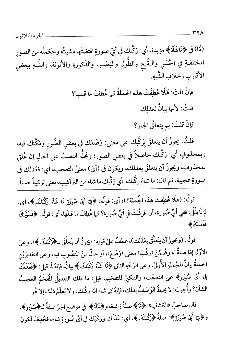 قال صاحب "الكشف": {مَّا} صلة زائدة، و {شَاءَ}: في موضع الجر صفة لـ {صُورَةٍ}، و {فِي أَيِّ صُورَةٍ}: صلة {رَكَّبَكَ}، أي: عدلك وركبك في أي صورة شاء، فحُذف لكون