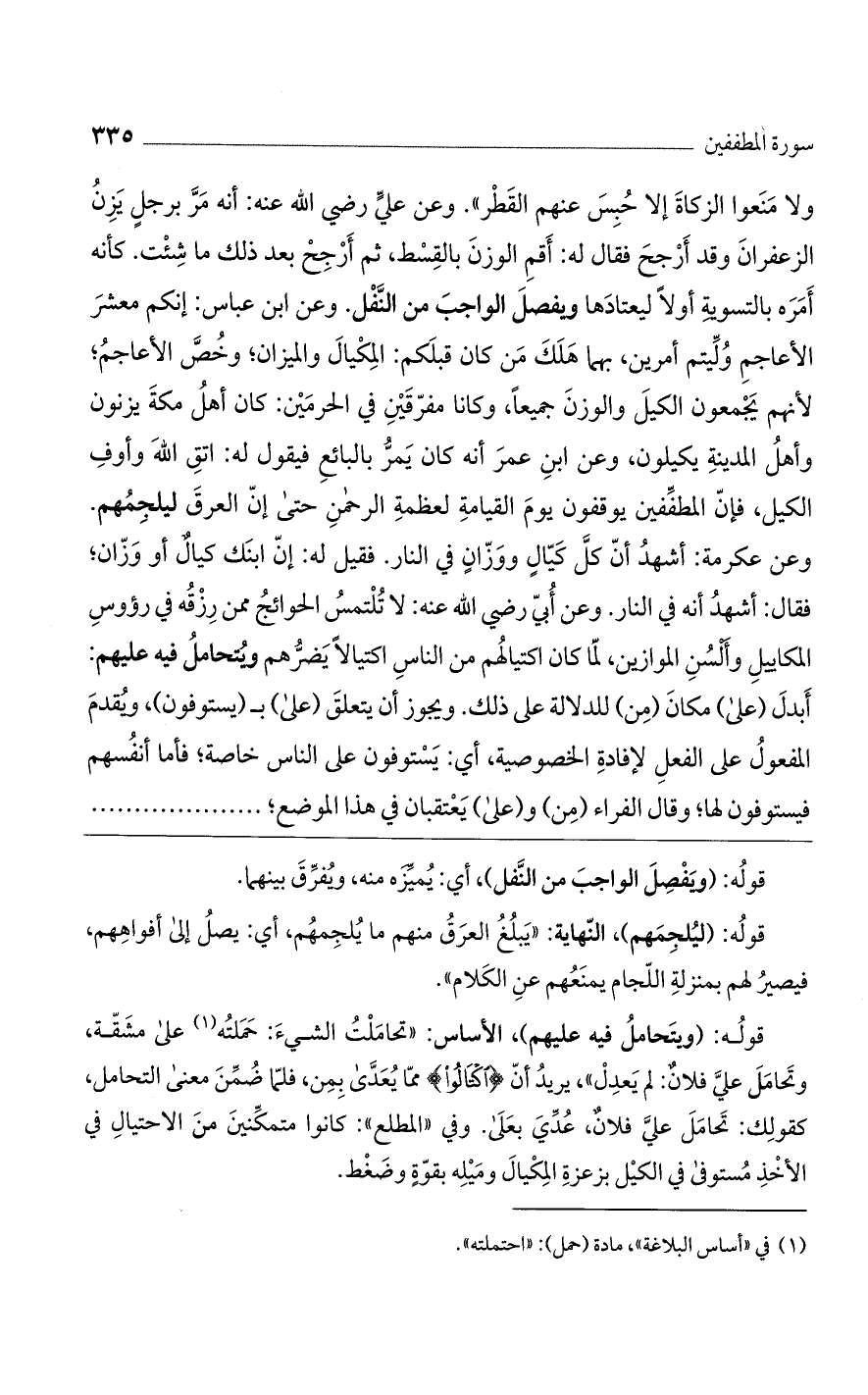 ولا منعوا الزكاة إلا حبس عنهم القطر». وعن على رضي الله عنه: أنه مر برجل يزن الزعفران وقد أرجح فقال له: أقم الوزن بالقسط، ثم أرجح بعد ذلك ما شئت. كأنه أمره بالتسوية أولاً ليعتادها ويفصل الواجب من النفل. وعن ابن عباس: إنكم معشر الأعاجم وليتم أمرين، بهما هلك من كان قبلكم: المكيال والميزان؛ وخص الأعاجم؛ لأنهم يجمعون الكيل والوزن جميعاً وكانا مفرّقين في الحرمين: كان أهل مكة يزنون وأهل المدينة يكيلون، وعن ابن عمر أنه كان يمر بالبائع فيقول له: اتق الله وأوف الكيل، فإنّ المطففين يوقفون يوم القيامة لعظمة الرحمن حتى إن العرق ليلجمهم. وعن عكرمة: أشهد أنّ كل كيالٍ ووزانٍ في النار. فقيل له: إنّ ابنك كيالٌ أو وزانٌ؛ فقال: أشهد أنه في النار. وعن أبىّ رضي الله عنه: لا تلتمس الحوائج ممن رزقه في رؤوس المكاييل وألسن الموازين، لما كان اكتيالهم من الناس اكتيالاً يضرهم ويتحامل فيه عليهم: أبدل «على» مكان «من» للدلالة على ذلك. ويجوز أن يتعلق «على» بـ "يستوفون"، ويقدم المفعول على الفعل لإفادة الخصوصية، أي: يستوفون على الناس خاصة؛ فأما أنفسهم فيستوفون لها؛ وقال الفراء «من» و «على» يعتقبان في هذا الموضع؛