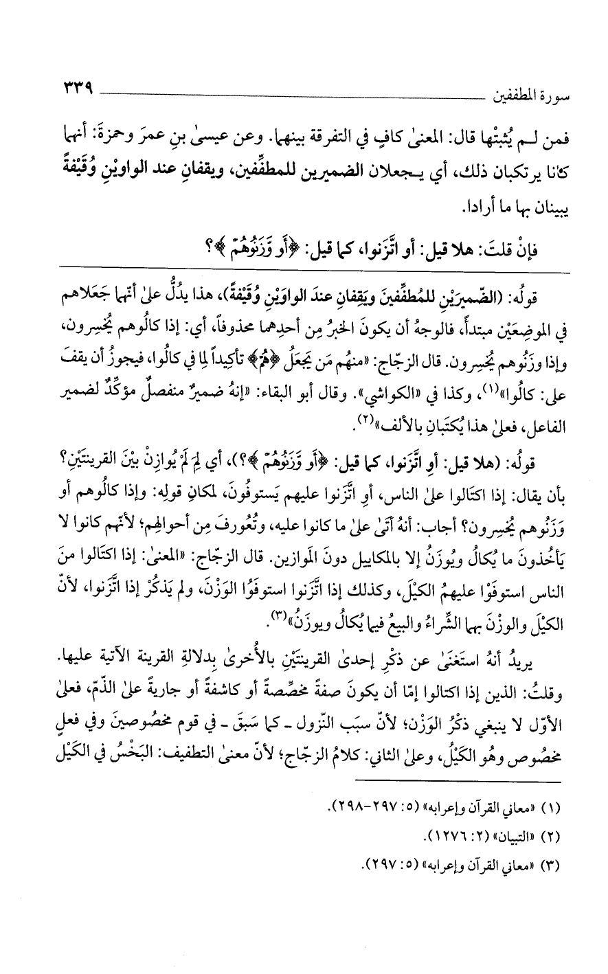 يريد أنه استغنى عن ذكر إحدى القرينتين بالأخرى بدلالة القرينة الآتية عليها. وقلت: الذين إذا اكتالوا إما أن يكون صفة مخصصة أو كاشفة أو جارية على الذم، فعلى الأول لا ينبغي ذكر الوزن؛ لأن سبب النزول - كما سبق - في قوم مخصوصين وفي فعل مخصوص وهو الكيل، وعلى الثاني: كلام الزجاج؛ لأن معنى التطفيف: البخس في الكيل