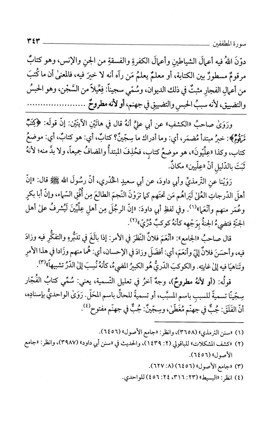 قوله: (أو لأنه مطروح)، وجه آخر في تعليل التسمية، يعني: سُمِّي كتاب الفُجار سجيناً تسمية للسبب باسم المسبب، أو تسمية للحال باسم المحل. روى الواحدي بإسناده، أن الفلق: جُب في جهنم مُغطى، وسجين: جُبٌّ في جهنم مفتوح.