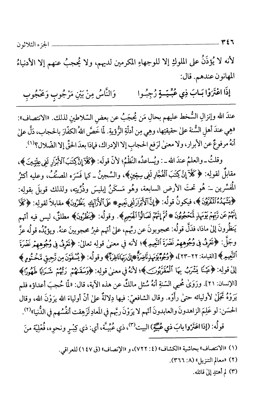 عند الله وإنزال السُّخط عليهم بحال من يُحجب عن بعض السلاطين لذلك. "الانتصاف": "هي عند أهل السنة على حقيقتها، وهي من أدلة الرؤية. لما خص الله الكفار بالحجاب، دل على أنه مرفوع عن الأبرار، ولا معنى لرفع الحجاب إلا الإدراك، فماذا بعد الحق إلا الضلال؟ .