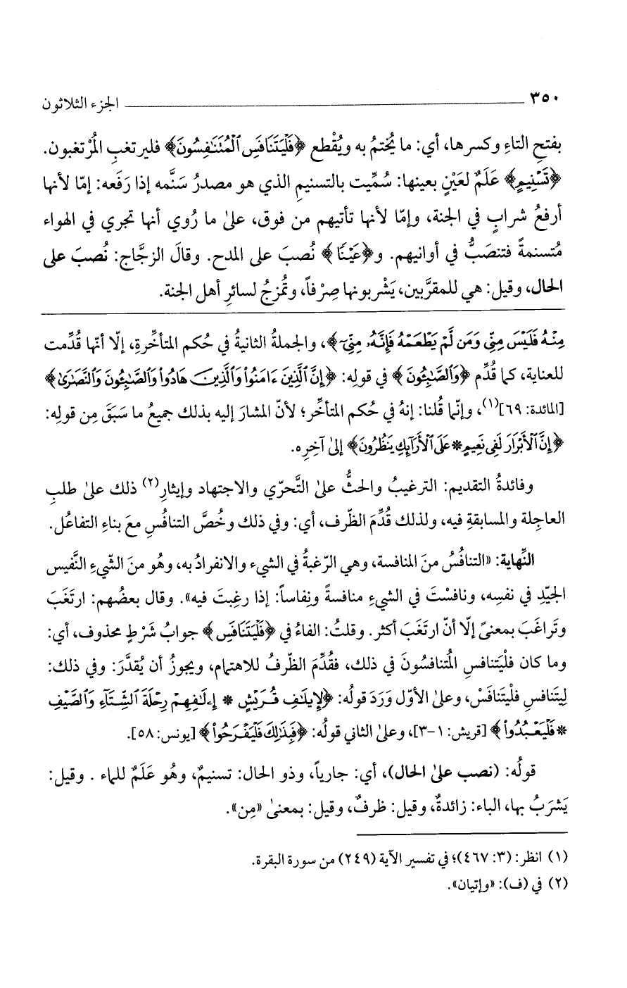 النهاية: "التنافس من المنافسة، وهي الرغبة في الشيء والانفراد به، وهو من الشيء النفيس الجيد في نفسه، ونافست في الشيء منافسة ونفاساً: إذا رغبت فيه". وقال بعضهم: ارتغب وتراغب بمعنى إلا أن ارتغب أكثر. وقلت: الفاء في {فَلْيَتَنَافَسِ} جواب شرط محذوف، أي: وما كان فليتنافس المتنافسون في ذلك، فقدم الظرف للاهتمام، ويجوز أن يقدر: وفي ذلك: ليتنافس المتنافسون، وعلى الأول ورد قوله: {لِإِيلَافِ قُرَيْشٍ (إِيلَافِهِمْ رِحْلَةَ الشِّتَاءِ وَالصَّيْفِ (فَلْيَعْبُدُوا} [قريش: 1 - 3]، وعلى الثاني قوله: {فَبِذَلِكَ فَلْيَفْرَحُوا} [يونس: 58].