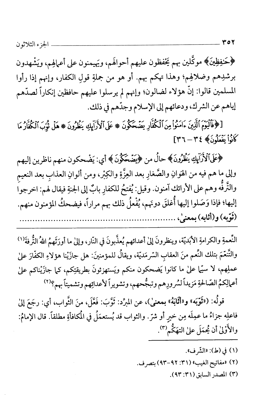 (عَلَى الأَرَائِكِ يَنظُرُونَ) حال من (يَضْحَكُونَ) أي: يضحكون منهم ناظرين إليهم وإلى ما هم فيه من الهوان والصغار بعد العزة والكبر، ومن ألوان العذاب بعد النعيم والترفه وهم على الأرائك آمنون. وقيل: يفتح للكفار باب إلى الجنة فيقال لهم: اخرجوا إليها؛ فإذا وصلوا إليها أغلق دونهم، يفعل ذلك بهم مرارا، فيضحك المؤمنون منهم. (ثوبه) و (أثابه) بمعنى،