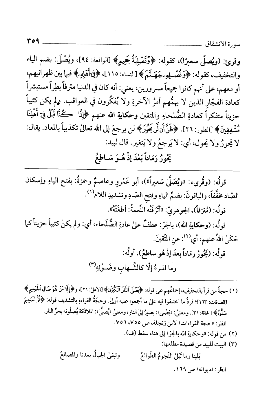 وقرئ: (ويصلى سعيراً)، كقوله: (وتَصْلِيَةُ جَحِيمٍ) [الواقعة: 94]، ويصلى: بضم الياء والتخفيف، كقوله: (ونُصْلِهِ جَهَنَّمَ) [النساء: 115]. (فِي أَهْلِهِ) فِيما أَهْلِهِ فيما بين ظهرانيهم، أو معهم، على أنهم كانوا جميعا مسرورين، يعني: أنه كان في الدنيا مترفاً بطراً مستبشرا كعادة الفجار الذين لا يهمهم أمر الآخرة ولا يفكرون في العواقب. ولم يكن كئيباً حزيناً متفكرا كعادة الصلحاء والمتقين وحكاية الله عنهم (إنَّا كُنَّا قَبْلُ فِي أَهْلِنَا مُشْفِقِينَ) [الطور: 26]. (ظَنَّ أَن لَّن يَحُورَ) لن يرجع إلى الله تعالى تكذيباً بالمعاد. يقال: لا يحور ولا يحول، أي: لا يرجع ولا يتغير. قال لبيد: