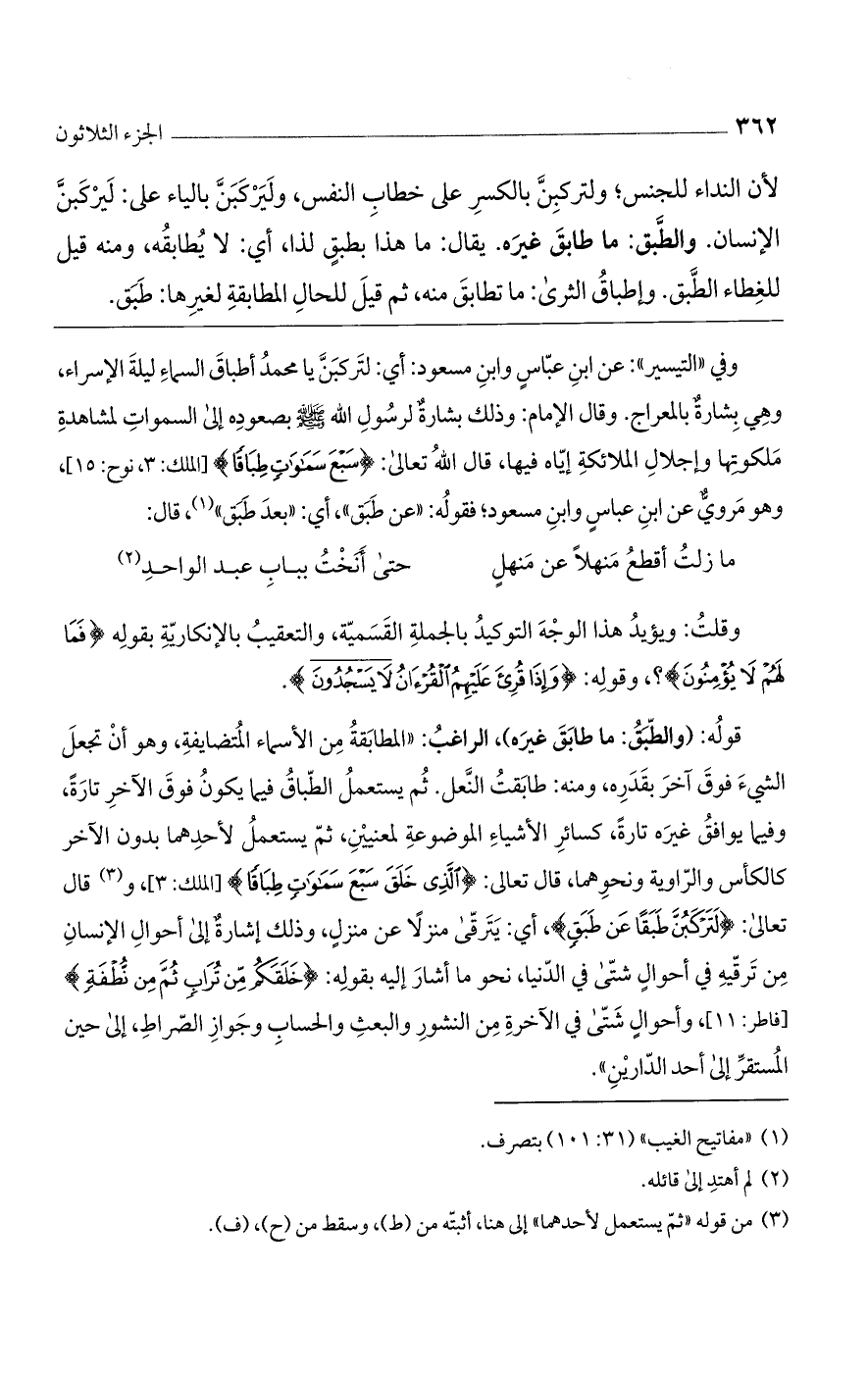 لأن النداء للجنس؛ ولتركبن بالكسر على خطاب النفس، وليركبن بالياء على: ليركبن الإنسان. والطبق: ما طابق غيره. يقال: ما هذا بطبق لذا، أي: لا يطابقه، ومنه قيل للغطاء الطبق. وإطباق الثرى: ما تطابق منه، ثم قيل للحال المطابقة لغيرها: طبق.