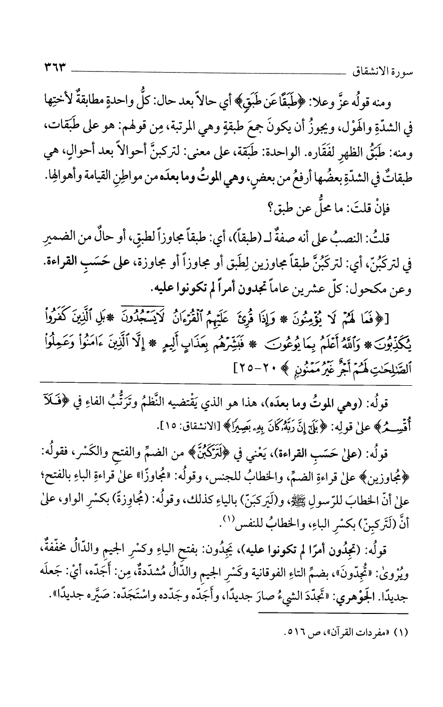 قلت: النصب على أنه صفة لـ (طبقاً)، أي: طبقاً مجاوزاً لطبق، أو حال من الضمير في لتركبن، أي: لتركبن طبقاً مجاوزين لطبق. أو مجاوزاً. أو مجاوزة، على حسب القراءة. وعن مكحول: كل عشرين عاماً تجدون أمراً لم تكونوا عليه.