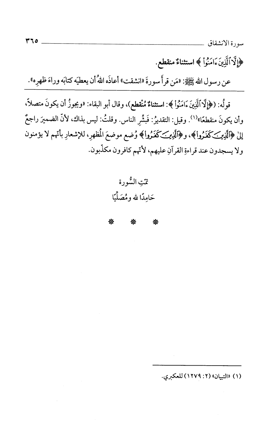 عن رسول الله صلى الله عليه وسلم: «من قرأ سورة «انشقت» أعاذه الله أن يعطيه كتابه وراء ظهره».