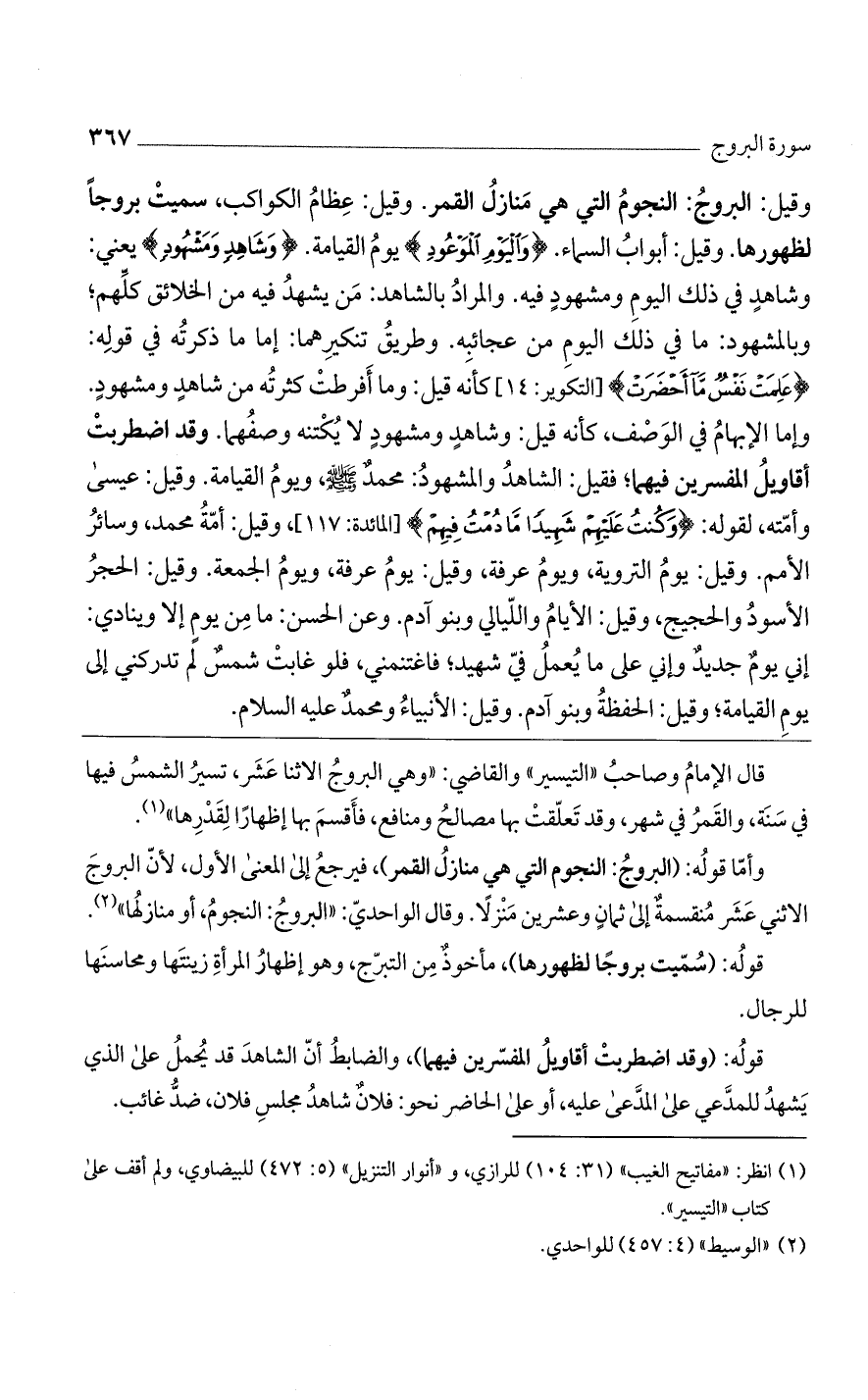 وأما قوله: (البروج: النجوم التي هي منازل القمر)، فيرجع إلى المعنى الأول، لأن البروج الاثنى عشر منقسمة إلى ثمان وعشرين منزلاً. وقال الواحدي: "البروج: النجوم، أو منازلها".
