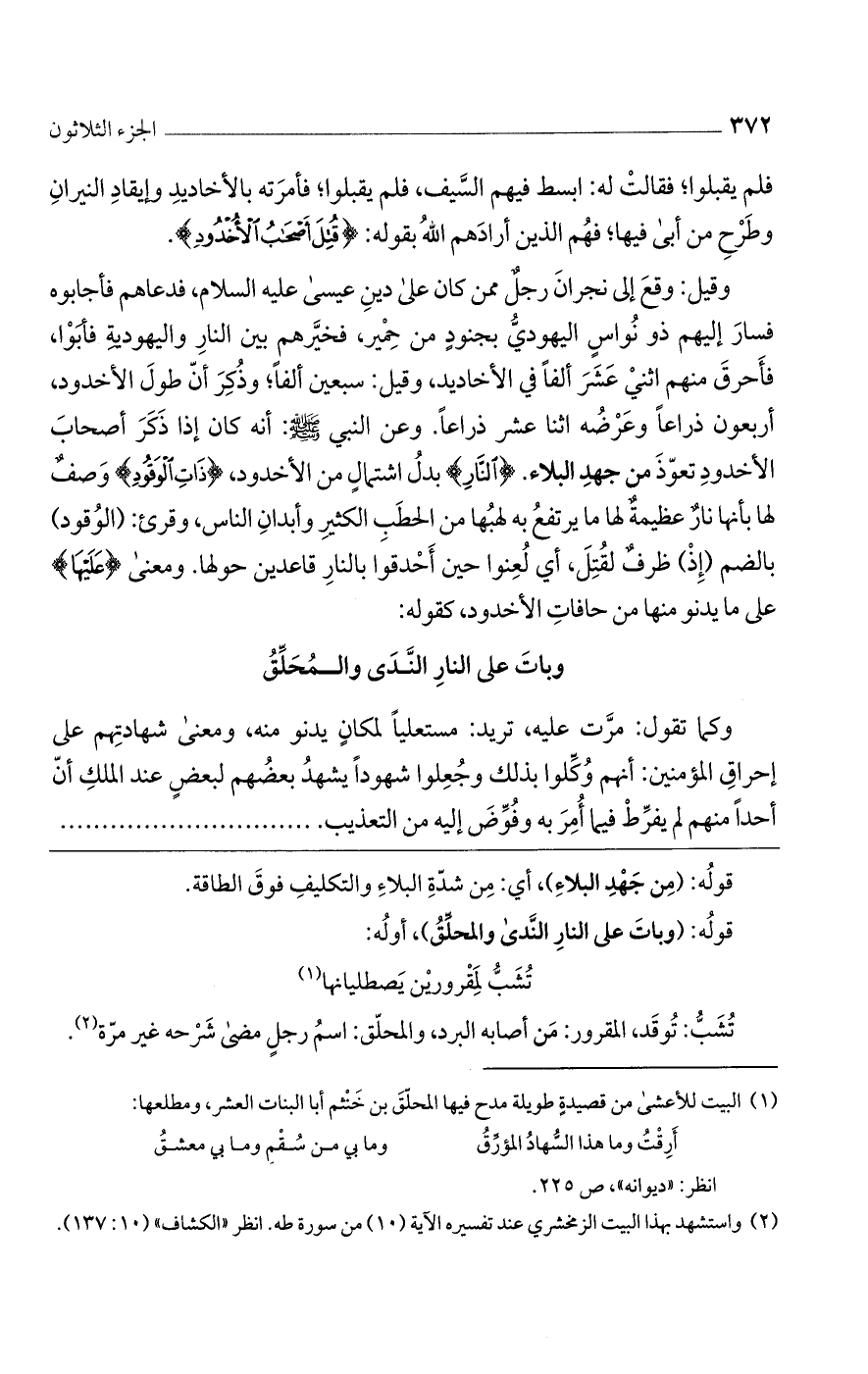 وقيل: وقع إلى نجران رجل ممن كان على دين عيسى عليه السلام، فدعاهم فأجابوه فسار إليهم ذو نواس اليهودي بجنود من حمير، فخيرهم بين النار واليهودية فأبوا، فأحرق منهم اثني عشر ألفاً في الأخاديد، وقيل: سبعين ألفاً؛ وذكر أن طول الأخدود، أربعون ذراعاً وعرضه اثنا عشر ذراعاً. وعن النبي صلى الله عليه وسلم: أنه كان إذا ذكر أصحاب الأخدود تعوذ من جهد البلاء. (النَّارِ) بدل اشتمال من الأخدود، (ذَاتِ الوَقُودِ) وصف لها بأنها نار عظيمة لها ما يرتفع به لهبها من الحطب الكثير وأبدان الناس، وقرئ: (الوقود)، بالضم (إِذْ) ظرف لقتل، أي لعنوا حين أحدقوا بالنار قاعدين حولها. ومعنى (عَلَيْهَا) على ما يدنو منها من حافات الأخدود، كقوله: