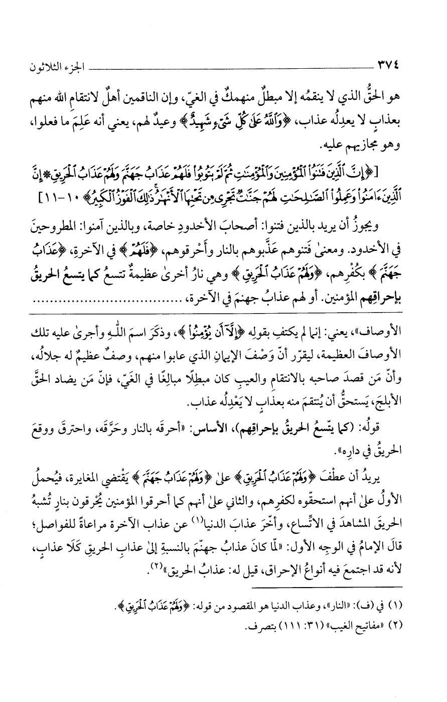 ويجوز أن يريد بالذين فتنوا: أصحاب الأخدود خاصة، وبالذين آمنوا: المطروحين في الأخدود. ومعنى فتنوهم عذبوهم بالنار وأحرقوهم، (فَلَهُمْ) في الآخرة، (عَذَابُ جَهَنَّمَ) بكفرهم، (ولَهُمْ عَذَابُ الحَرِيقِ) وهي نار أخرى عظيمة تتسع كما يتسع الحريق بإحراقهم المؤمنين. أو لهم عذاب جهنم في الآخرة،