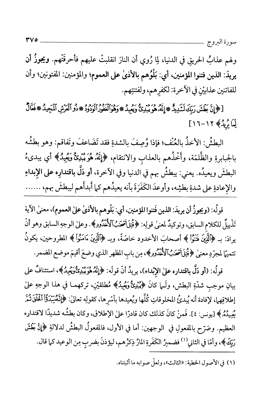 البطش: الأخذ بالعنف؛ فإذا وصف بالشدة فقد تضاعف وتفاقم: وهو بطشه بالجبابرة والظلمة، وأخذهم بالعذاب والانتقام، (إنَّهُ هُوَ يُبْدِئُ ويُعِيدُ) أي يبدئ البطش ويعيده. يعني: يبطش بهم في الدنيا وفي الآخرة، أو دل باقتداره على الإبداء والاعادة على شدة بطشه، وأوعد الكفرة بأنه يعيدهم كما أبدأهم ليبطش بهم،