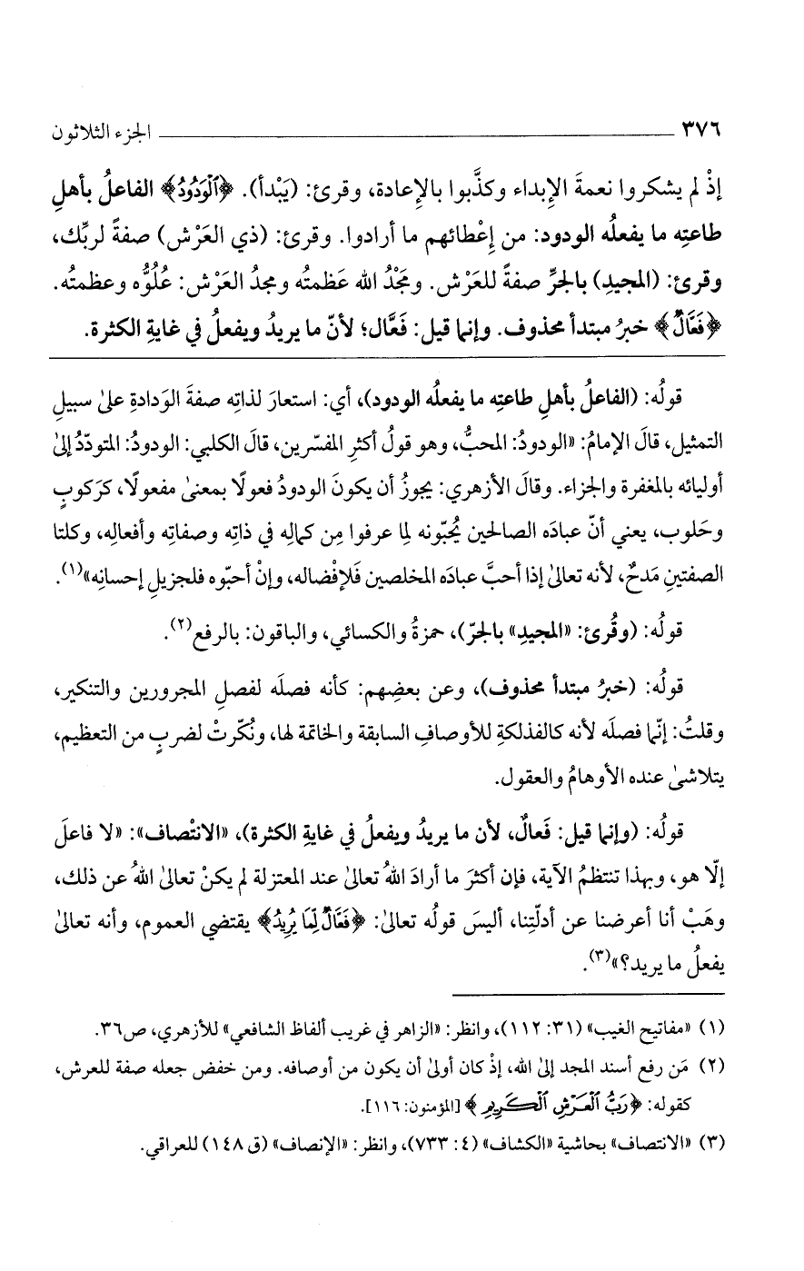 قوله: (وإنما قيل: فعال، لأن ما يريد ويفعل في غاية الكثرة)، "الانتصاف": "لا فاعل إلا هو، وبهذا تنتظم الآية، فإن أكثر ما أراد الله تعالى عند المعتزلة لم يكن تعالى الله عن ذلك، وهب أنا أعرضنا عن أدلتنا، أليس قوله تعالى: {فَعَّالٌ لِّمَا يُرِيدُ} يقتضي العموم، وأنه تعالى يفعل ما يريد؟ ".