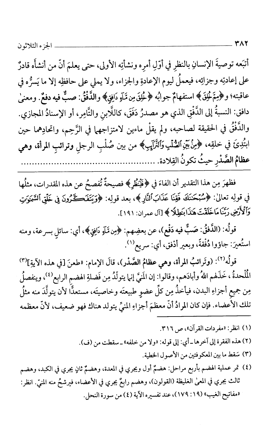 قوله: (وترائب المرأة، وهي عظام الصدر)، قال الإمام: "طعن [في هذه الآية] الملحدة، خذلهم الله وأبادهم، وقالوا: إن المني إنما يتولد من فضلة الهضم الرابع، وينفصل من جميع أجزاء البدن، فيأخذ من كل عضو طبيعته وخاصيته، مستعداً لأن يتولد منه مثل تلك الأعضاء. فإن كان المراد أن معظم أجزاء المني يتولد هناك فهو ضعيف، لأن معظمه