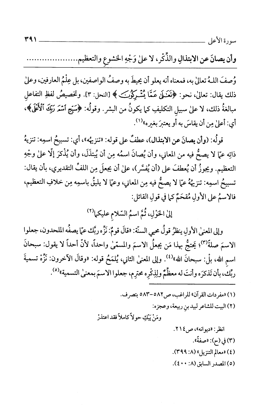 قوله: (وأن يصان عن الابتذال)، عطف على قوله: "تنزيهه"، أي: تسبيح اسمه: تنزيه ذاته عما لا يصح فيه من المعاني، وأن يصان اسمه من أن يبتذل، وأن يُذكر إلا على وجه التعظيم. ويجوز أن يُعطف على (أن يفسر)، على أن يجعل من اللف التقدير، بأن يقال: تسبيح اسمه: تنزيهه عما لا يصح فيه من المعاني، وعما لا يليق باسمه من خلاف التعظيم، فالاسم على الأول مُقحم كما في قول القائل: