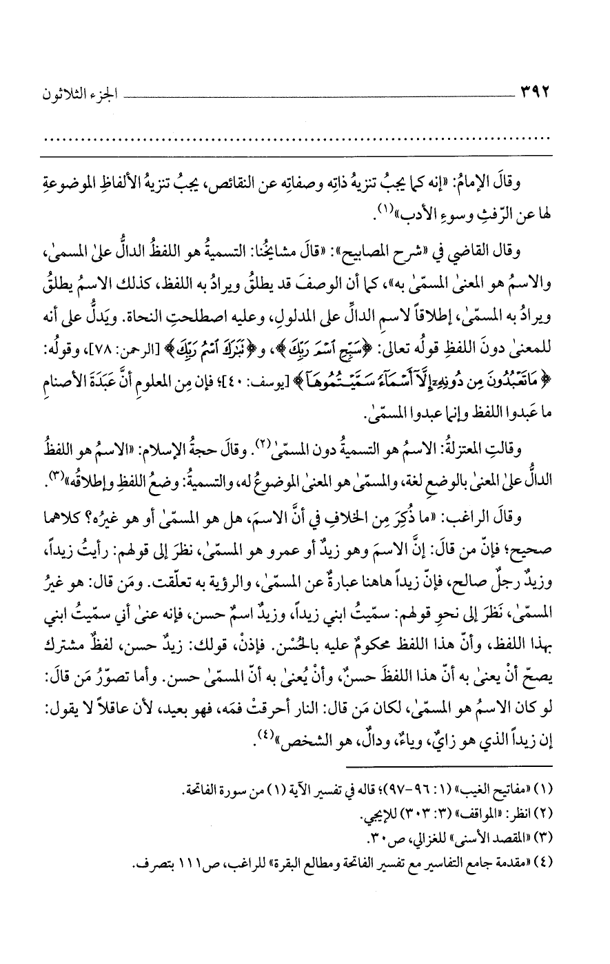 وقال القاضي في "شرح المصابيح": "قال مشايخنا: التسمية هو اللفظ الدال على المسمى، والاسم هو المعنى المسمى به"، كما أن الوصف قد يطلق ويراد به اللفظ، كذلك الاسم يطلق ويراد به المسمى، إطلاقاً لاسم الدال على المدلول، وعليه اصطلحت النحاة. ويدل على أنه للمعنى دون اللفظ قوله تعالى: {سَبِّحِ اسْمَ رَبِّكَ}، و {تَبَارَكَ اسْمُ رَبِّكَ} [الرحمن: 78]، وقوله: {مَا تَعْبُدُونَ مِن دُونِهِ إِلَّا أَسْمَاءً سَمَّيْتُمُوهَا} [يوسف: 40]؛ فإن من المعلوم أن عبدة الأصنام ما عبدوا اللفظ وإنما عبدوا المسمى.