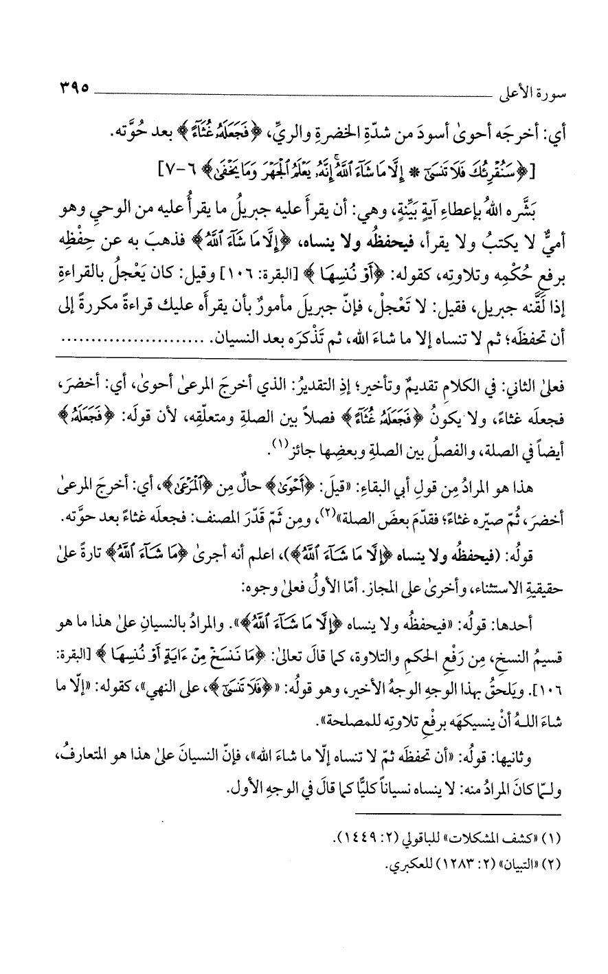 أحدها: قوله: "فيحفظه ولا ينساه {إِلَّا مَا شَاءَ اللَّهُ} ". والمراد بالنسيان على هذا ما هو قسيم النسخ، من رفع الحكم والتلاوة، كما قال تعالى: {مَا نَنسَخْ مِنْ آيَةٍ أَوْ نُنسِهَا} [البقرة: 106]. ويلحق بهذا الوجه الوجه الأخير، وهو قوله: " {فَلَا تَنسَى}، على النهي"، كقوله: "إلا ما شاء الله أن ينسيكهه برفع تلاوته للمصلحة".