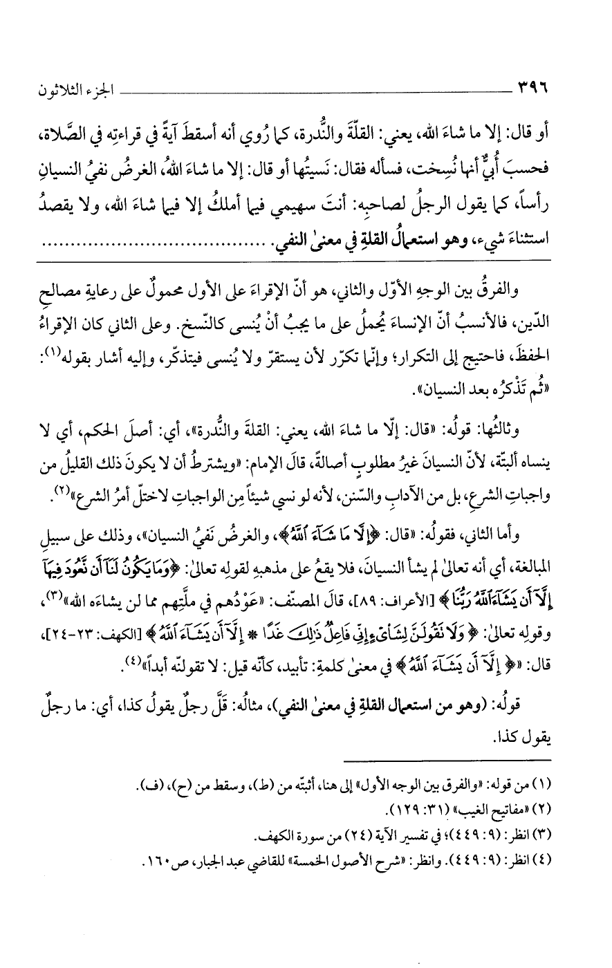 وثالثها: قوله: "قال: إلا ما شاء الله، يعني: القلة والنُّدرة"، أي: أصل الحكم، أي لا ينساه البتة، لأن النسيان غير مطلوب أصالة، قال الإمام: "ويشترط أن لا يكون ذلك القليل من واجبات الشرع، بل من الآداب والسنن، لأنه لو نسى شيئاً من الواجبات لاختل أمر الشرع".