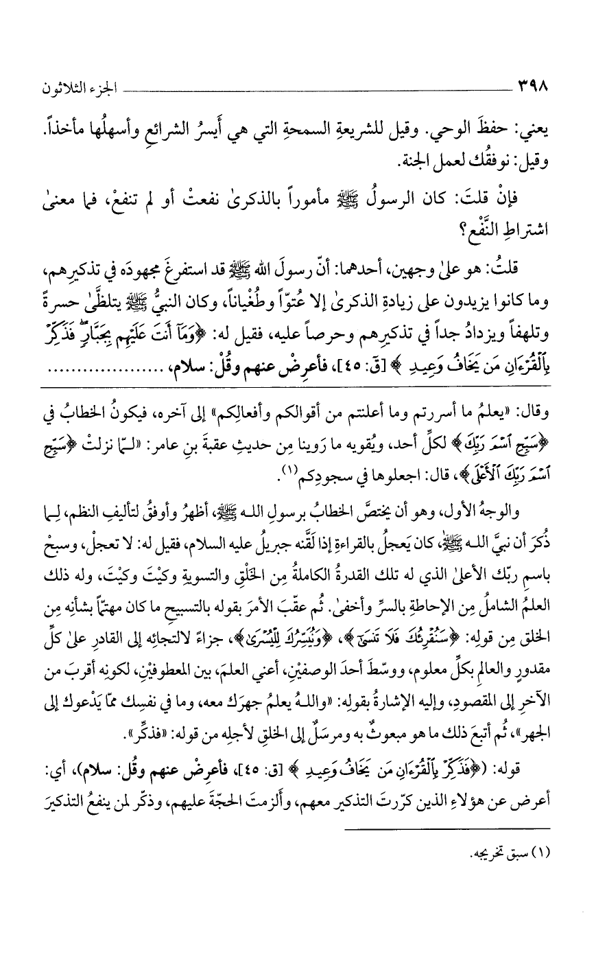 وقال: "يعلم ما أسررتم وما أعلنتم من أقوالكم وأفعالكم" إلى آخره، فيكون الخطاب في {سَبِّحِ اسْمَ رَبِّكَ} لكل أحد، ويقويه ما روينا من حديث عقبة بن عامر: "لما نزلت {سَبِّحِ اسْمَ رَبِّكَ الْأَعْلَى}، قال: اجعلوها في سجودكم.