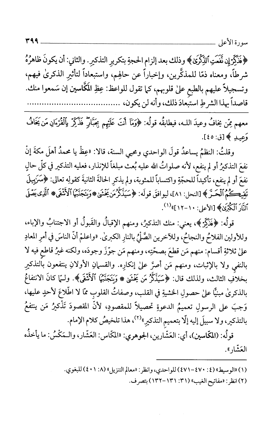 وقلت: النظم يساعد قول الواحدي ومحيي السنة، قالا: "عِظْ يا محمد أهل مكة إن نفع التذكير أو لم ينفع، لأنه صلوات الله عليه بُعث مبلغاً للإنذار، فعليه التذكير في كل حال نفع أو لم ينفع، تأكيداً للحجة واكتساباً للمثوبة، ولم يذكر الحالة الثانية كقوله تعالى: {سَرَابِيلَ تَقِيكُمُ الْحَرَّ} [النحل: 81]، ليوافق قوله: {سَيَذَّكَّرُ مَن يَخْشَى (وَيَتَجَنَّبُهَا الْأَشْقَى (الَّذِي يَصْلَى النَّارَ الْكُبْرَى} [الأعلى: 10 - 12] ".