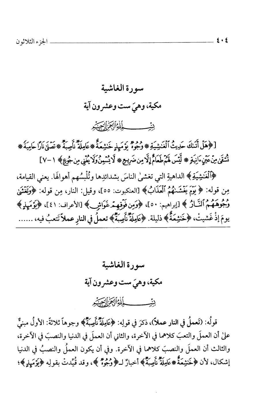 (الغَاشِيَةِ) الداهية التي تغشى الناس بشدائدها وتلبسهم أهوالها. يعني القيامة، من قوله: (يَوْمَ يَغْشَاهُمُ العَذَابُ) [العنكبوت: 55]، وقيل: النار، من قوله: (وتَغْشَى وجُوهَهُمُ النَّارُ) [إبراهيم: 50]، (ومِن فَوْقِهِمْ غَوَاشٍ) [الأعراف: 41]، (يَوْمَئِذٍ) يوم إذ غشيت، (خَاشِعَةٌ) ذليلة. (عَامِلَةٌ نَّاصِبَةٌ) تعمل في النار عملاً تتعب فيه،