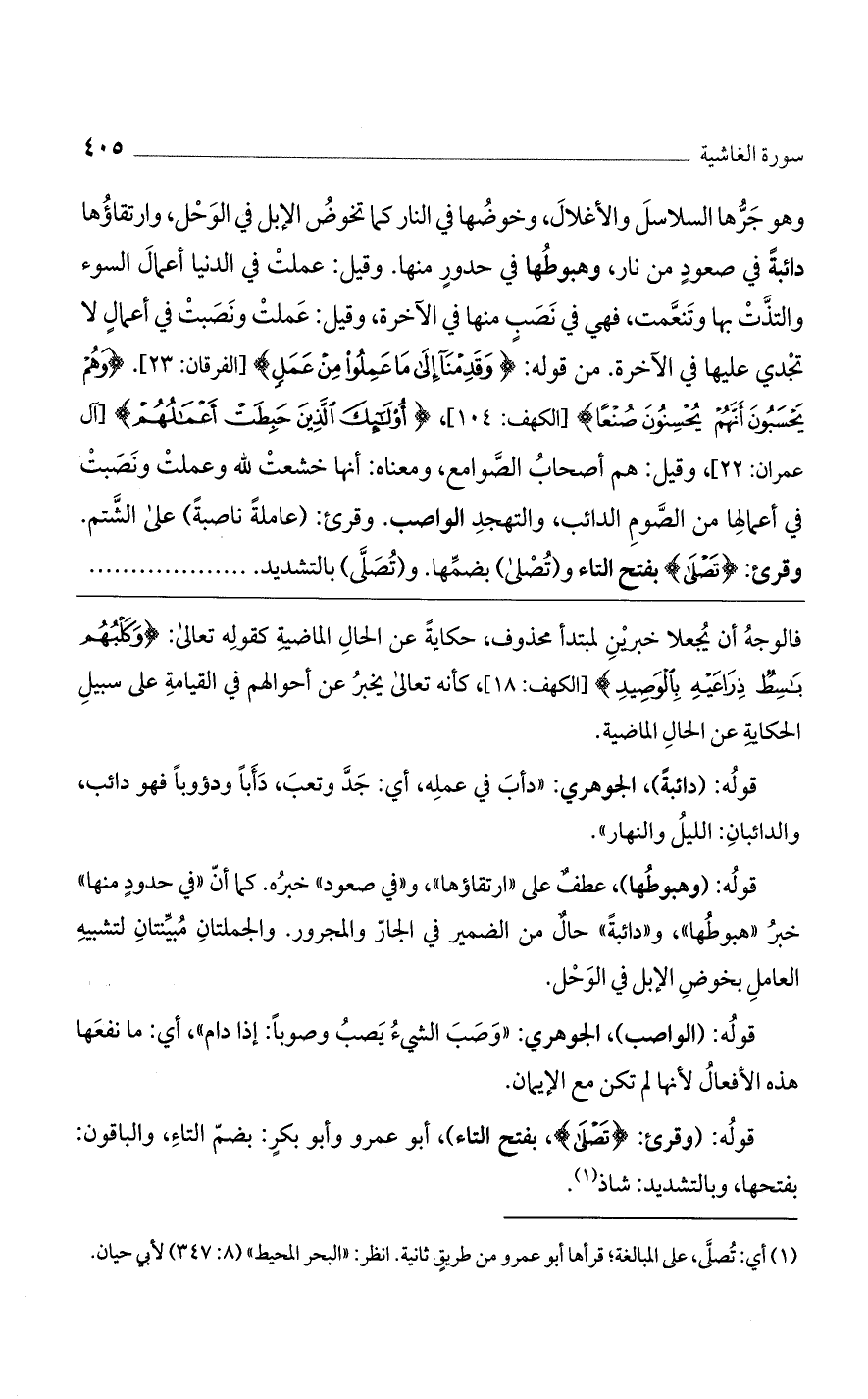 وهو جرها السلاسل والأغلال، وخوضها في النار كما تخوض الإبل في الوحل، وارتقاؤها دائبة في صعود من نار، وهبوطها في حدور منها. وقيل: عملت في الدنيا أعمال السوء والتذت بها وتنعمت، فهي في نصب منها في الآخرة، وقيل: عملت ونصبت في أعمال لا تجدي عليها في الآخرة. من قوله: (وقَدِمْنَا إلَى مَا عَمِلُوا مِنْ عَمَلٍ) [الفرقان: 23]. (وهُمْ يَحْسَبُونَ أَنَّهُمْ يُحْسِنُونَ صُنْعًا) [الكهف: 104]، (أُوْلَئِكَ الَّذِينَ حَبِطَتْ أَعْمَالُهُمْ) [آل عمران: 22] وقيل: هم أصحاب الصوامع، ومعناه: أنها خشعت لله وعملت ونصبت في أعمالها من الصوم الدائب، والتهجد الواصب. وقرئ: (عاملة ناصبة) على الشتم. قرئ: (تَصْلَى) بفتح التاء. و (تصلى) بضمها. وتصلى بالتشديد.
