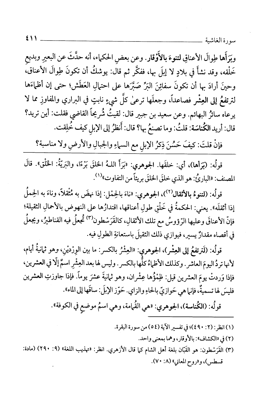 وبرأها طوال الأعناق لتنوء بالأوقار. وعن بعض الحكماء، أنه حدث عن البعير وبديع خلقه، وقد نشأ في بلاد لا إبل بها، ففكر ثم قال: يوشك أن تكون طوال الأعناق، وحين أراد بها أن تكون سفائن البر صبرها على احتمال العطش؛ حتى إن أظماءها لترتفع إلى العشر فصاعداً، وجعلها ترعى كل شيء نابت في البراري والمفاوز مما لا يرعاه سائر البهائم. وعن سعيد بن جبير قال: لقيت شريحاً القاضي فقلت: أين تريد؟ قال: أريد الكناسة: قلت: وما تصنع بها؟ قال: أنظر إلى الإبل كيف خلقت.