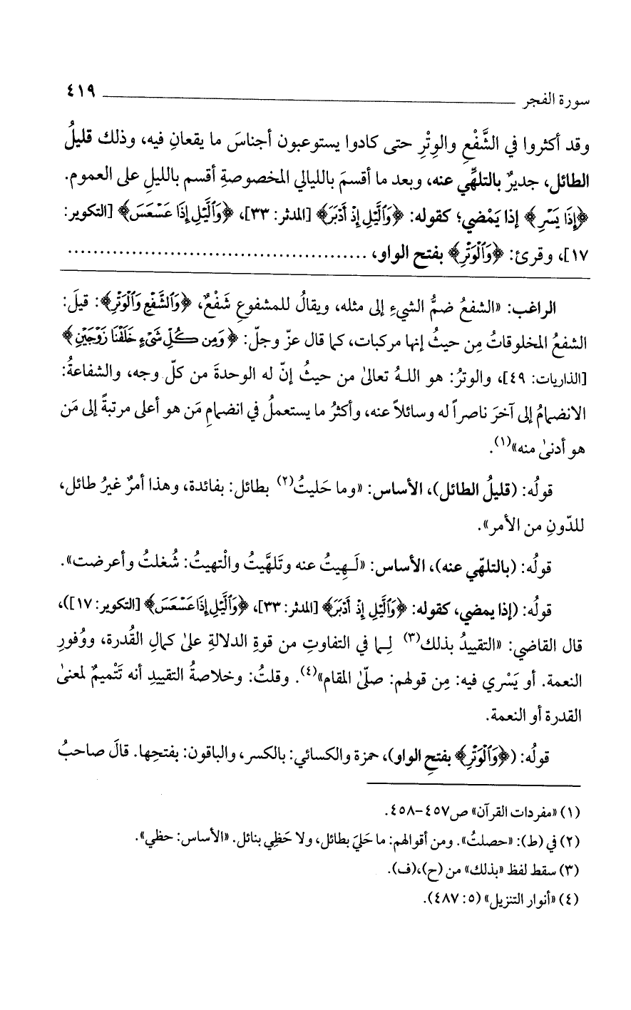 وقد أكثروا في الشفع والوتر حتى كادوا يستوعبون أجناس ما يقعان فيه، وذلك قليل الطائل، جدير بالتلهي عنه، وبعد ما أقسم بالليالي المخصوصة أقسم بالليل على العموم. (إذَا يَسْرِ) إذا يمضي؛ كقوله: (واللَّيْلِ إذْ أَدْبَرَ) بالمدثر: 33]، (واللَّيْلِ إذَا عَسْعَسَ) [التكوير: 17]. وقرئ: (والْوَتْرِ) بفتح الواو،