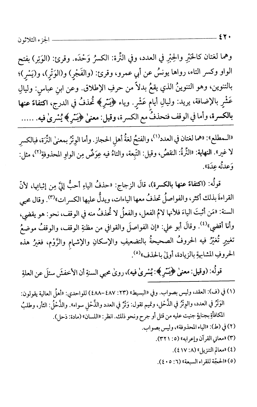 قوله: (اكتفاء عنها بالكسرة)، قال الزجاج: "حذف الياء أحب إليِّ من إثباتها، لأن القراءة بذلك أكثر، والفواصل تحذف معها الياءات، ويدل عليها الكسرات". وقال محيي السنة: "من أثبت الياء فلأنها لام الفعل، والفعل لا تُحذف منه في الوقف، نحو: هو يقضي، وأنا أقضي". وقال أبو علي: "إن الفواصل والقوافي من مظنة الوقف، والوقف موضع تغيير تُغير فيه الحروف الصحيحة بالتضعيف والإسكان والإشمام والرَّوم، فغير هذه الحروف المشابهة بالزيادة، أولى بالحذف".