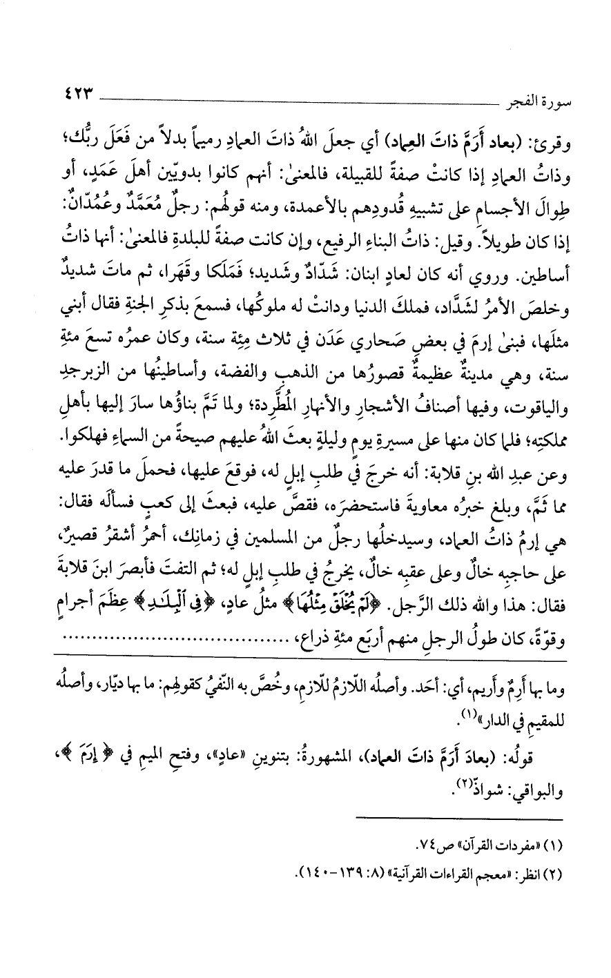 قوله: (بعاد أرم ذات العماد)، المشهورة: بتنوين "عادٍ"، وفتح الميم في {إِرَمَ}، والبواقي: شواذ.
