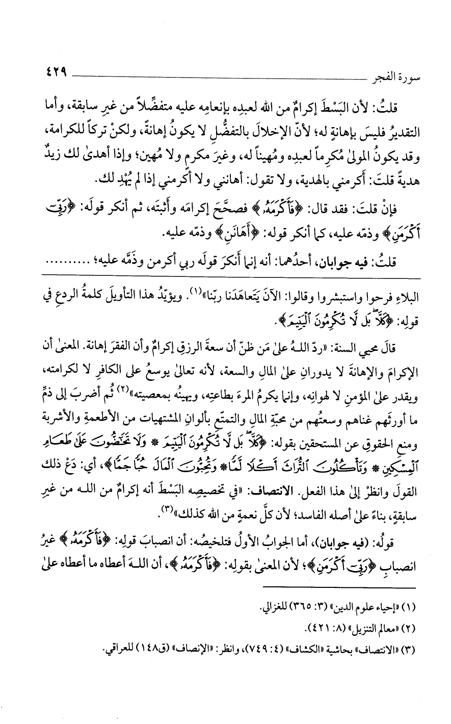 قال محيي السنة: "رد الله على من ظن أن سعة الرزق إكرام وأن الفقر إهانة. المعنى أن الإكرام والإهانة لا يدوران على المال والسعة، لأنه تعالى يوسع على الكافر لا لكرامته، ويقدر على المؤمن لا لهوانه، وإنما يكرم المرء بطاعته، ويهينه بمعصيته" ثم أضرب إلى ذم ما أورثهم غناهم وسعتهم من محبة المال والتمتع بألوان المشتهيات من الأطعمة والأشربة ومنع الحقوق عن المستحقين بقوله: {كَلَّا بَل لَّا تُكْرِمُونَ الْيَتِيمَ (وَلَا تَحَاضُّونَ عَلَى طَعَامِ الْمِسْكِينِ (وَتَأْكُلُونَ التُّرَاثَ أَكْلًا لَّمًّا (وَتُحِبُّونَ الْمَالَ حُبًّا جَمًّا}، أي: دع ذلك القول وانظر إلى هذا الفعل. الانتصاف: "في تخصيصه البسط أنه إكرام من الله من غير سابقة، بناءً على أصله الفاسد؛ لأن كل نعمة من الله كذلك".