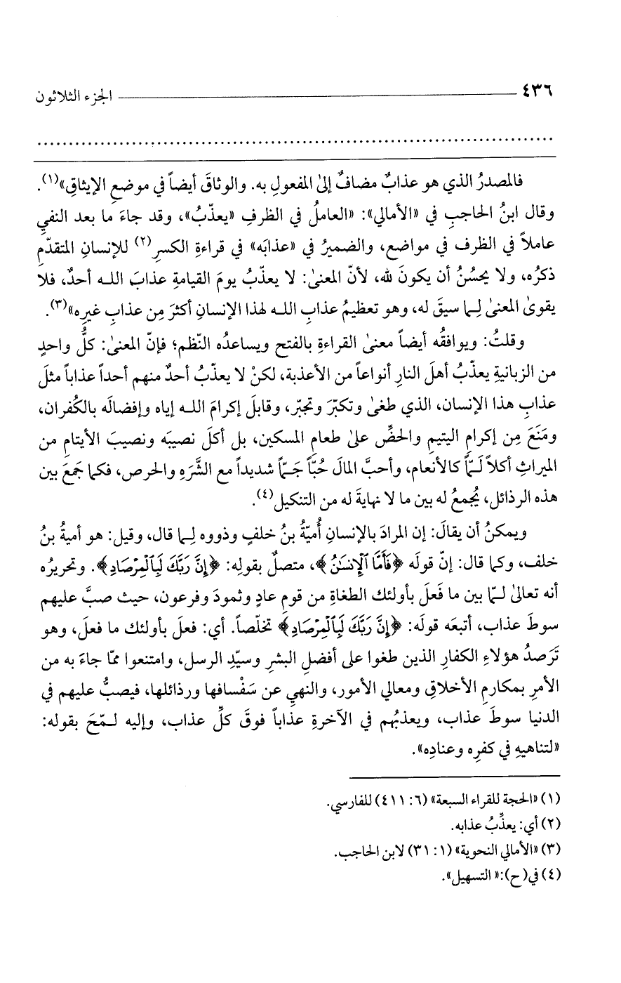 فالمصدر الذي هو عذاب مضاف إلى المفعول به. والوثاق أيضاً في موضع الإيثاق". وقال ابن الحاجب في "الأمالي": "العامل في الظرف "يعذب"، وقد جاء ما بعد النفي عاملاً في الظرف في مواضع، والضمير في "عذابه" في قراءة الكسر للإنسان المتقدم ذكره، ولا يحسن أن يكون لله، لأن المعنى: لا يعذب يوم القيامة عذاب الله أحد، فلا يقوى المعنى لما سيق له، وهو تعظيم عذاب الله لهذا الإنسان أكثر من عذاب غيره".