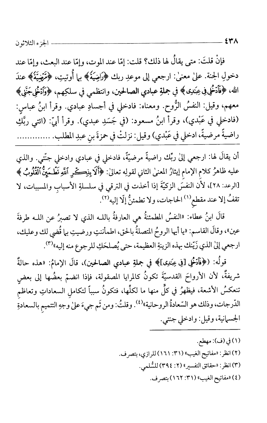 أن يقال لها: ارجعي إلى ربك راضية مرضية، فادخلي في عبادي وادخلي جنتي. والذي عليه ظاهر كلام الإمام إيثار المعنى الثاني لقوله تعالى: {أَلَا بِذِكْرِ اللَّهِ تَطْمَئِنُّ الْقُلُوبُ} [الرعد: 28]، لأن النفس الزكية إذا أخذت في الترقي في سلسلة الأسباب والمسببات، لا تقف إلا عند مقطع الحاجات، ولا تطمئن إلا إليه.