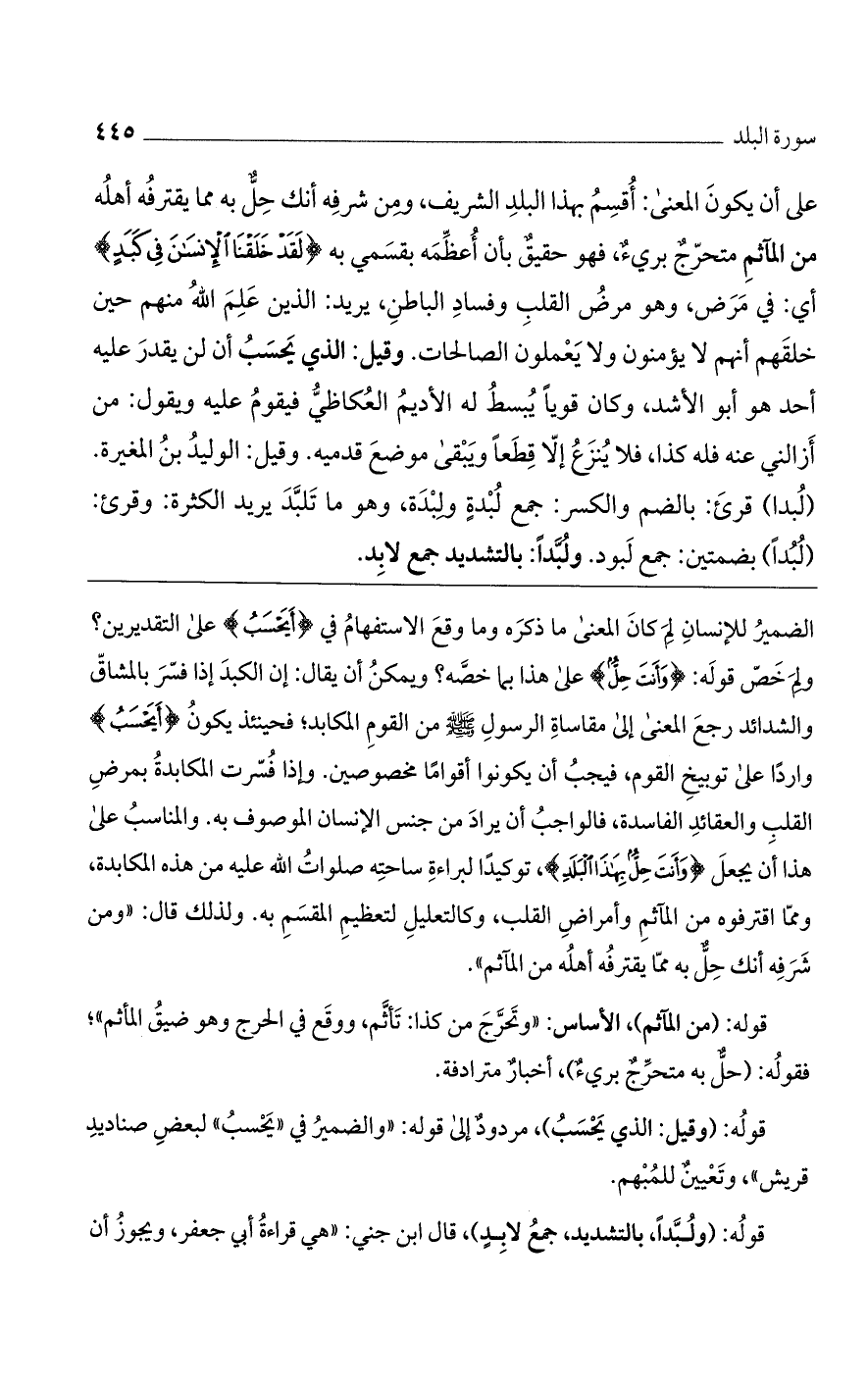على أن يكون المعنى: أقسم بهذا البلد الشريف، ومن شرفه أنك حل به مما يقترفه أهله من المآثم متحرٌج بريٌء، فهو حقيق بأن أعظمه بقسمي به (لَقَدْ خَلَقْنَا الْإِنْسانَ فِي كَبَدٍ) أي: في مرض، وهو مرض القلب وفساد الباطن، يريد: الذين علم الله منهم حين خلقهم أنهم لا يؤمنون ولا يعملون الصالحات. وقيل: الذي يحسب أن لن يقدر عليه أحد هو أبو الأشد، وكان قويًا يبسط له الأديم العكاظي فيقوم عليه ويقول: من أزالني عنه فله كذا، فلا ينزع إلا قطعًا ويبقى موضع قدميه. وقيل: الوليد بن المغيرة. (لُبَداً) قرى: بالضم والكسر: جمع لبدةٍ ولبدة، وهو ما تلبد يريد الكثرة: وقرئ: (لبدا) بضمتين: جمع لبود. ولبدا: بالتشديد جمع لا بد.