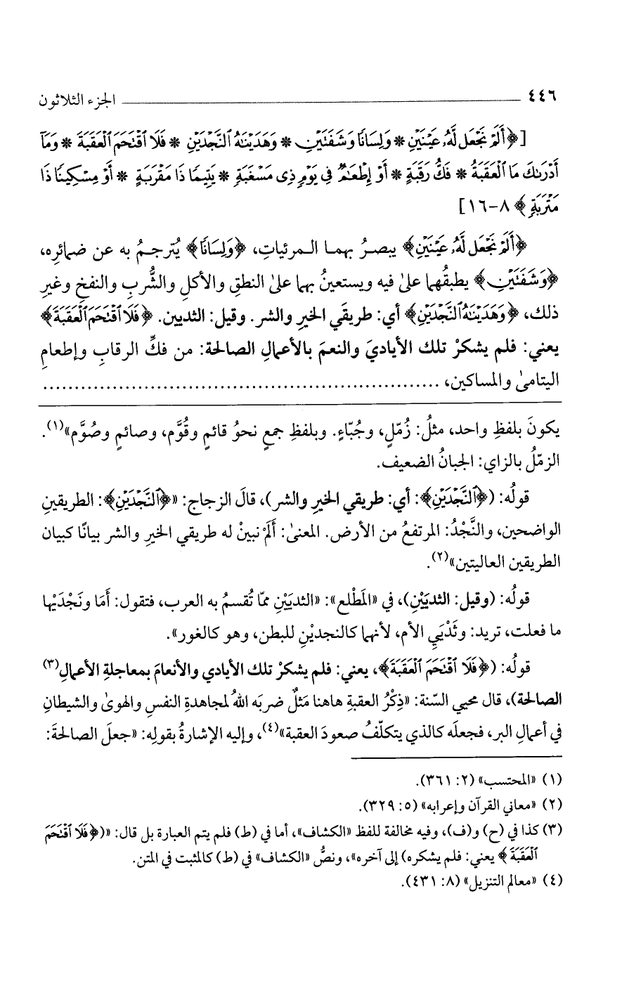 (أَلَمْ نَجْعَلْ لَهُ عَيْنَيْنِ) يبصر بهما المرئيات، (وَلِساناً) يترجم به عن ضمائره، (وَشَفَتَيْنِ) يطبقهما على فيه ويستعين بهما على النطق والأكل والشرب والنفخ وغير ذلك، (وَهَدَيْناهُ النَّجْدَيْنِ) أي: طريقي الخير والشر. وقيل: الثديين. (فَلَا اقْتَحَمَ الْعَقَبَةَ) يعنى: فلم يشكر تلك الأيادي والنعم بالأعمال الصالحة: من فك الرقاب وإطعام اليتامى والمساكين،